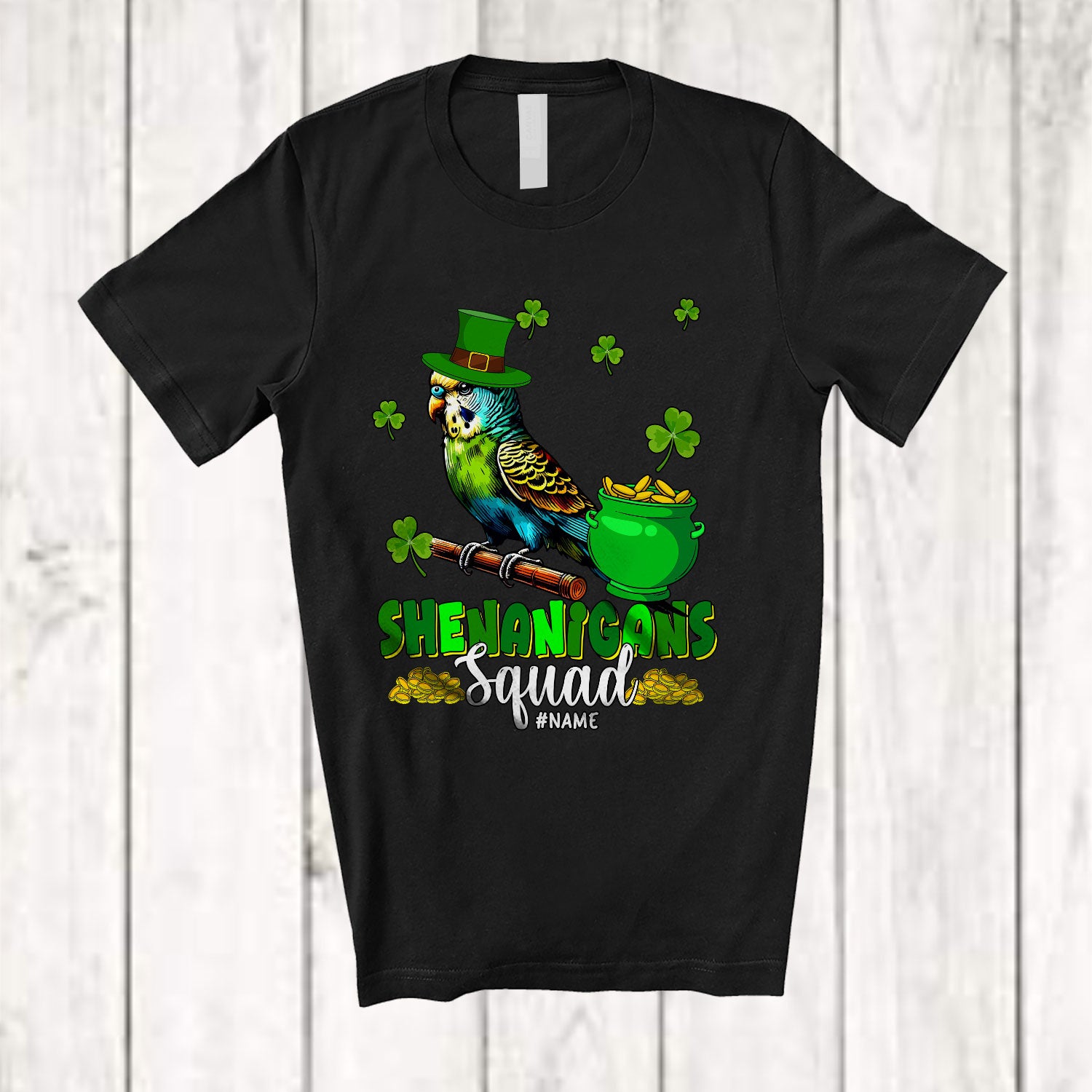 Personalized Custom Name Shenanigans Squad; Amusing St. Patrick's Day Macaw Bird; Family T-Shirt. This cotton t-shirt is a durable staple product with a classic fit. One of the most popular items, it has a relaxed style made for everyday and casual wear.