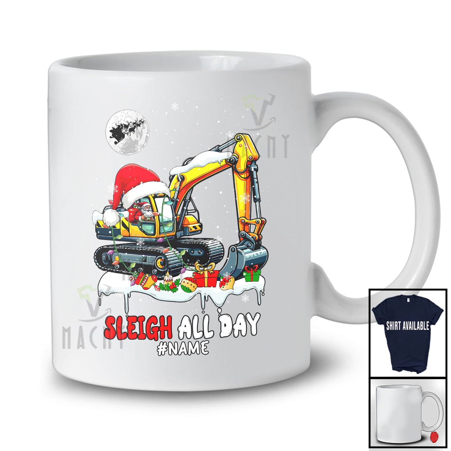 Personalized Custom Name Sleigh All Day; Awesome Christmas Santa Riding Excavator; Family T-Shirt. This cotton t-shirt is a durable staple product with a classic fit. One of the most popular items, it has a relaxed style made for everyday and casual wear.