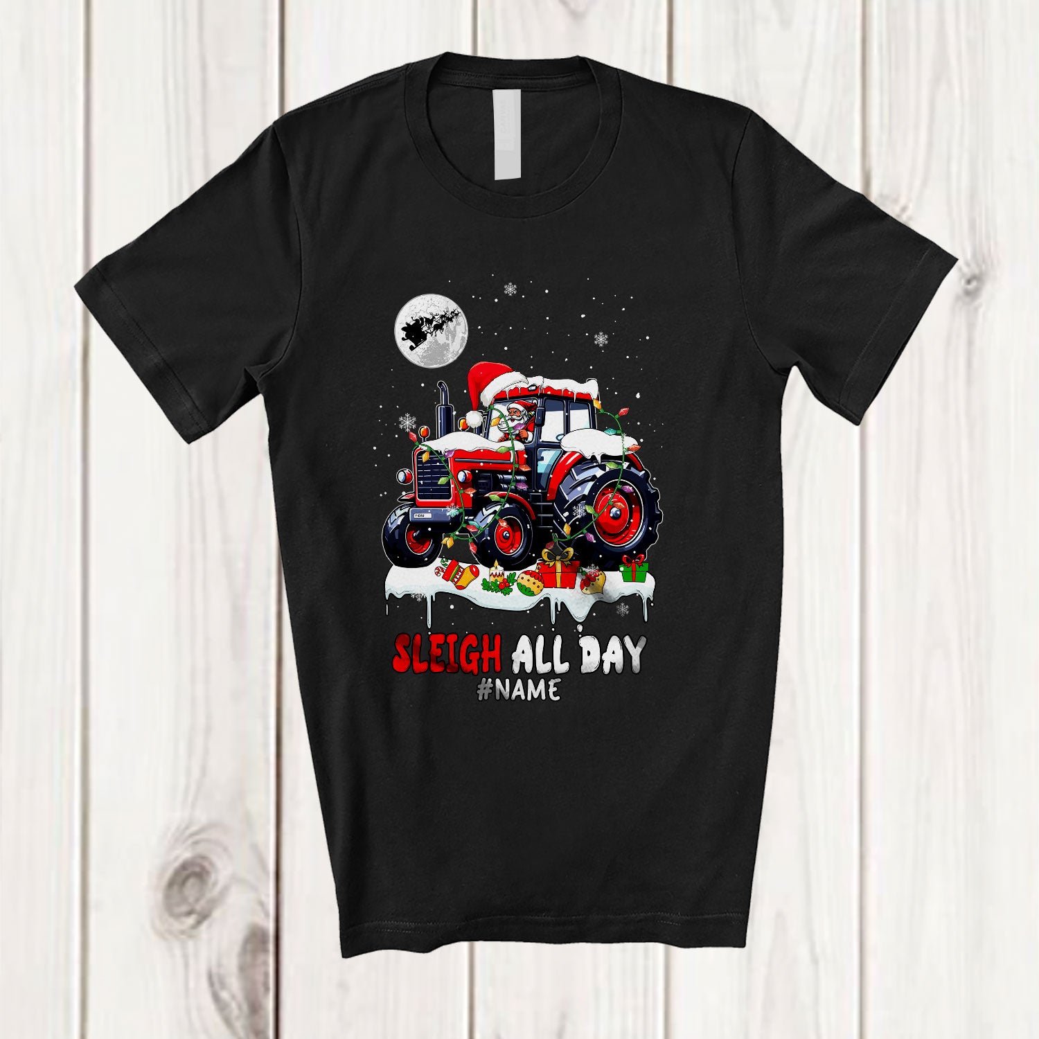 Personalized Custom Name Sleigh All Day; Awesome Christmas Santa Riding Tractor Truck; Family T-Shirt. This cotton t-shirt is a durable staple product with a classic fit. One of the most popular items, it has a relaxed style made for everyday and casual wear.