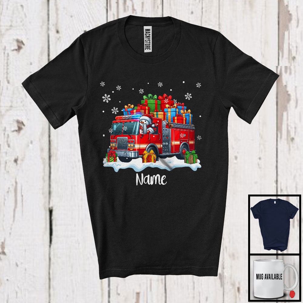 Personalized Custom Name Snowman Driving Fire Truck, Adorable Christmas Rider, X-mas Team T-Shirt