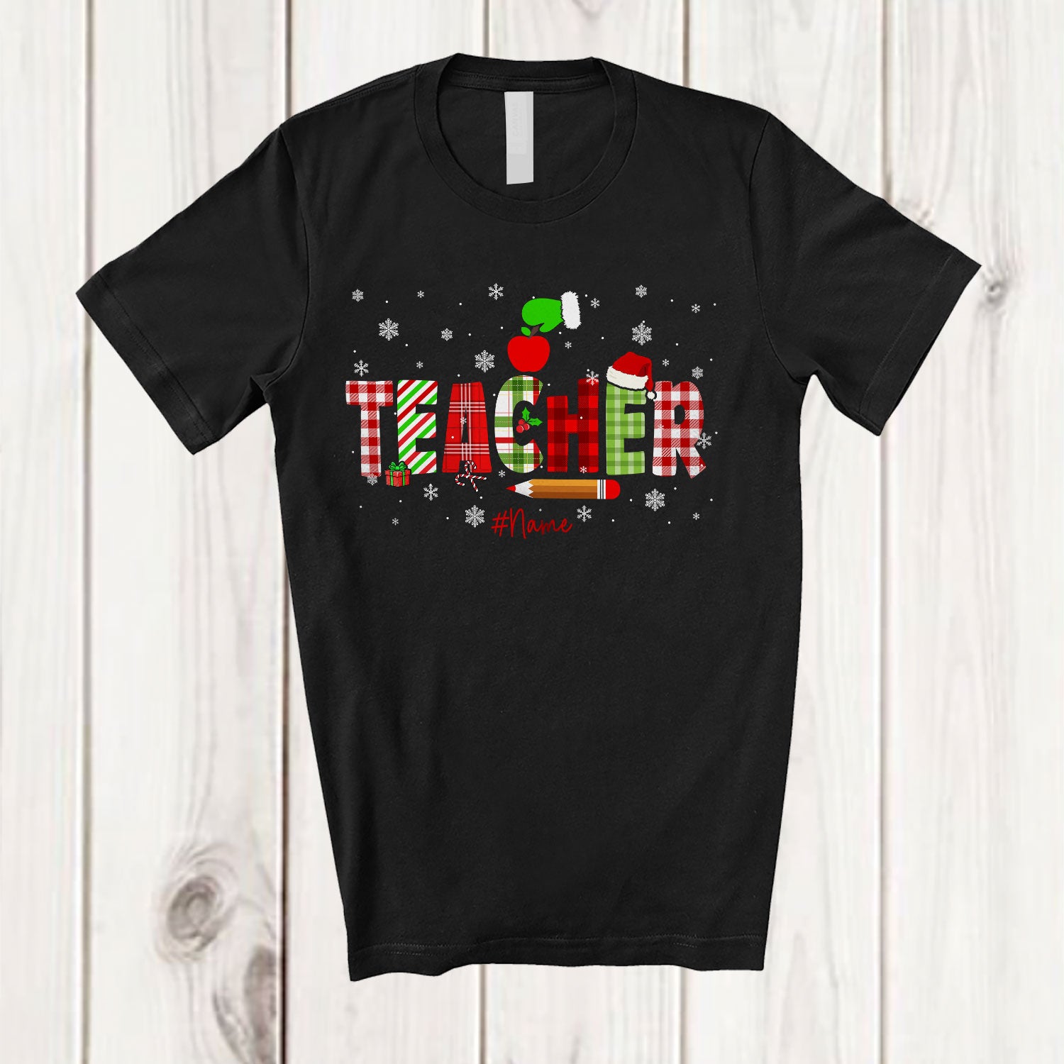 Personalized Custom Name Teacher; Lovely Christmas Plaid Green Santa Hand; Teacher Squad T-Shirt. This cotton t-shirt is a durable staple product with a classic fit. One of the most popular items, it has a relaxed style made for everyday and casual wear.