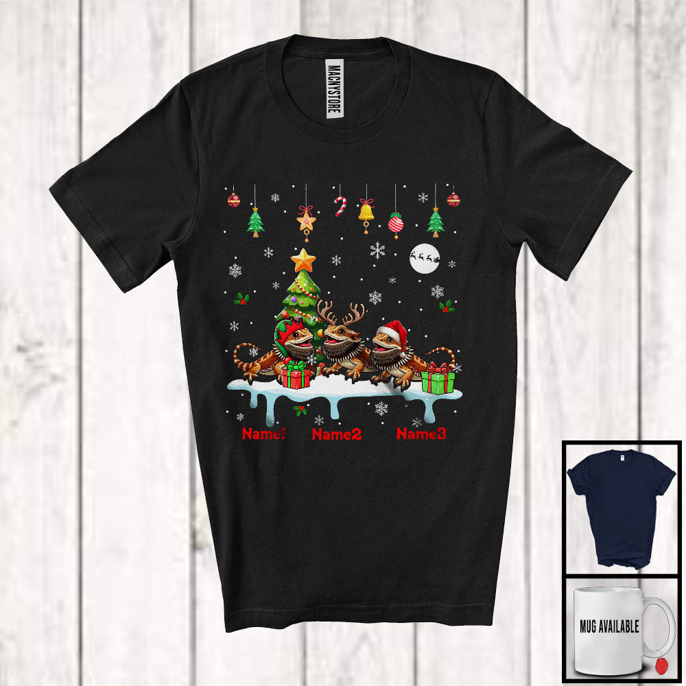 Personalized Custom Name Three Elf Santa Bearded Dragon Snowing; Joyful Christmas Tree Animal T-Shirt