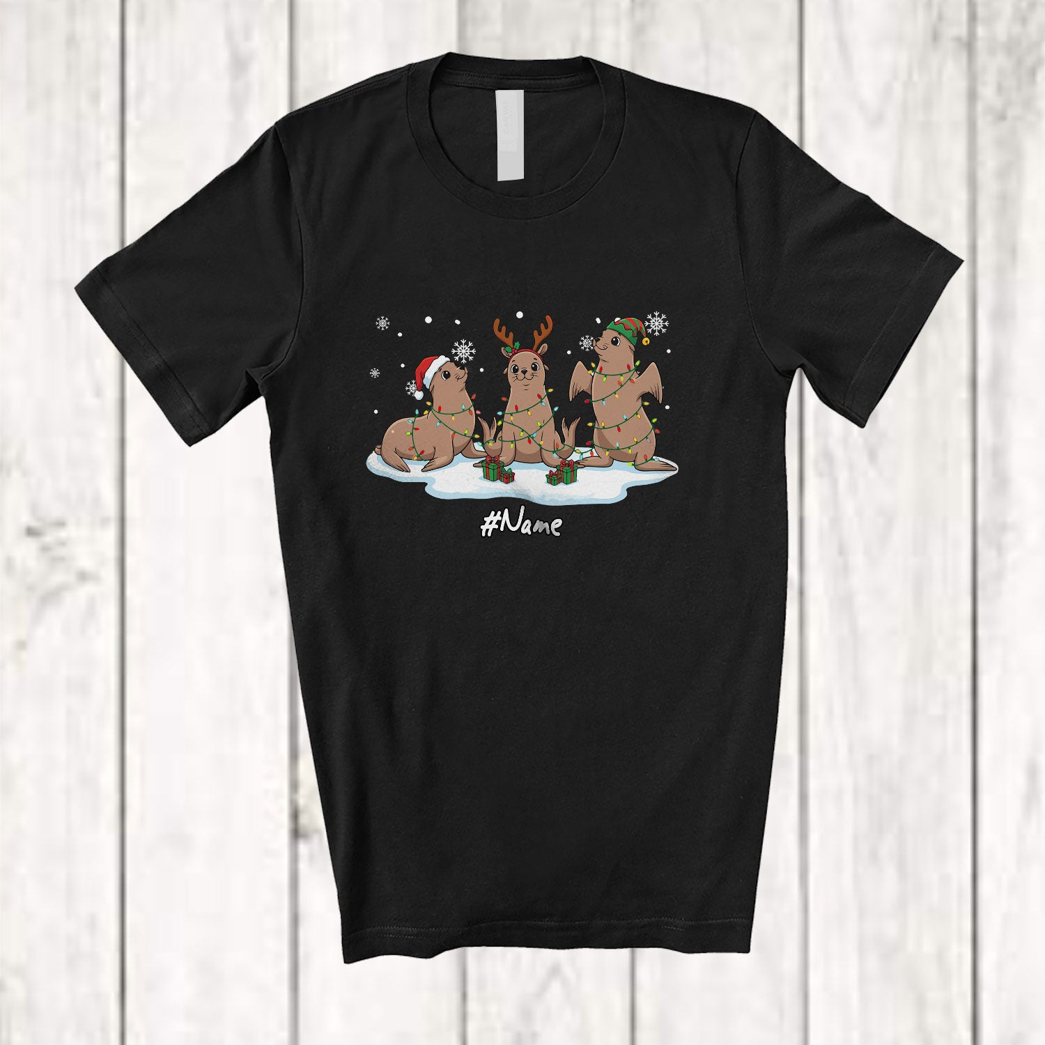 Personalized Custom Name Three Santa Elf Sea Lion Snowing; Lovely Christmas Lights Sea Animal T-Shirt