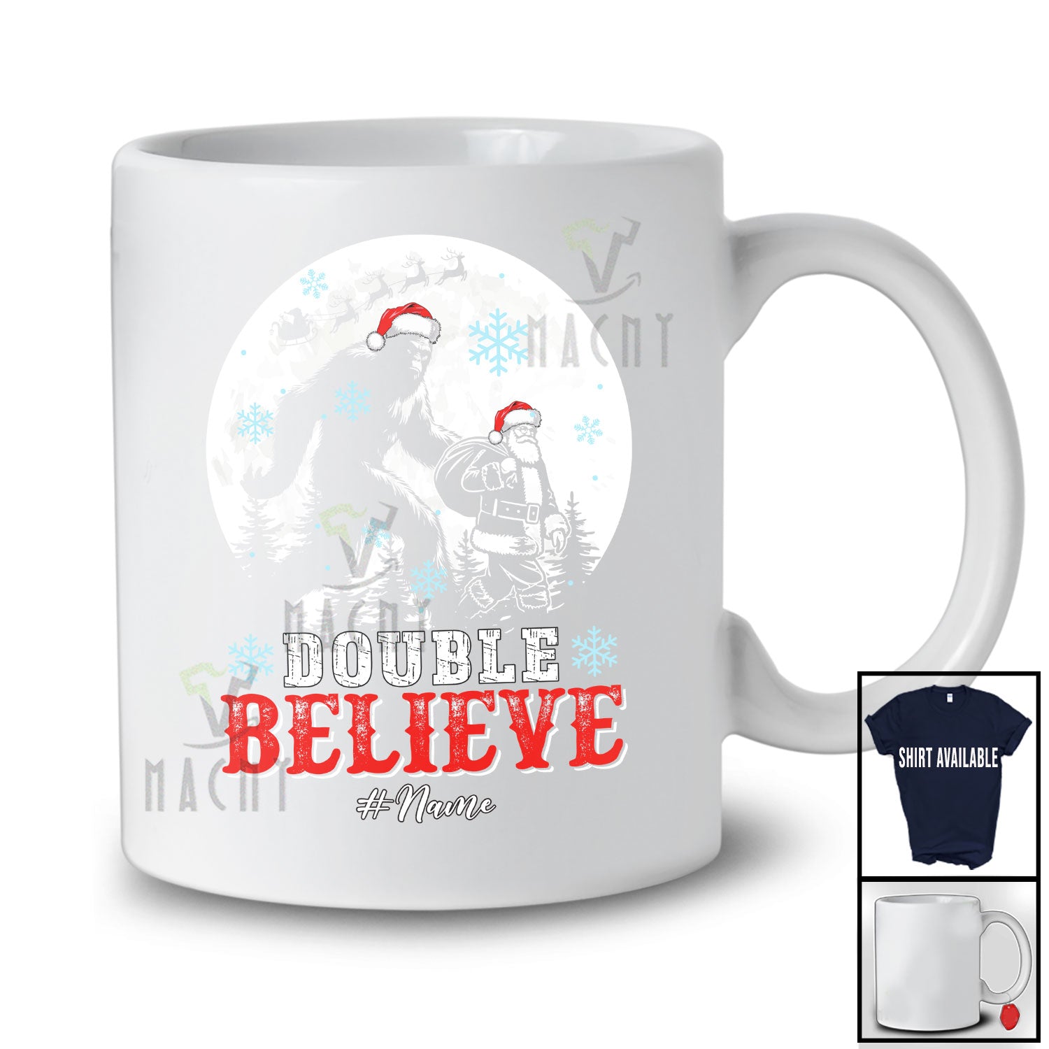 Personalized Double Believe; Amusing Christmas Custom Name Santa Bigfoot Forest; Moon T-Shirt. This cotton t-shirt is a durable staple product with a classic fit. One of the most popular items, it has a relaxed style made for everyday and casual wear.