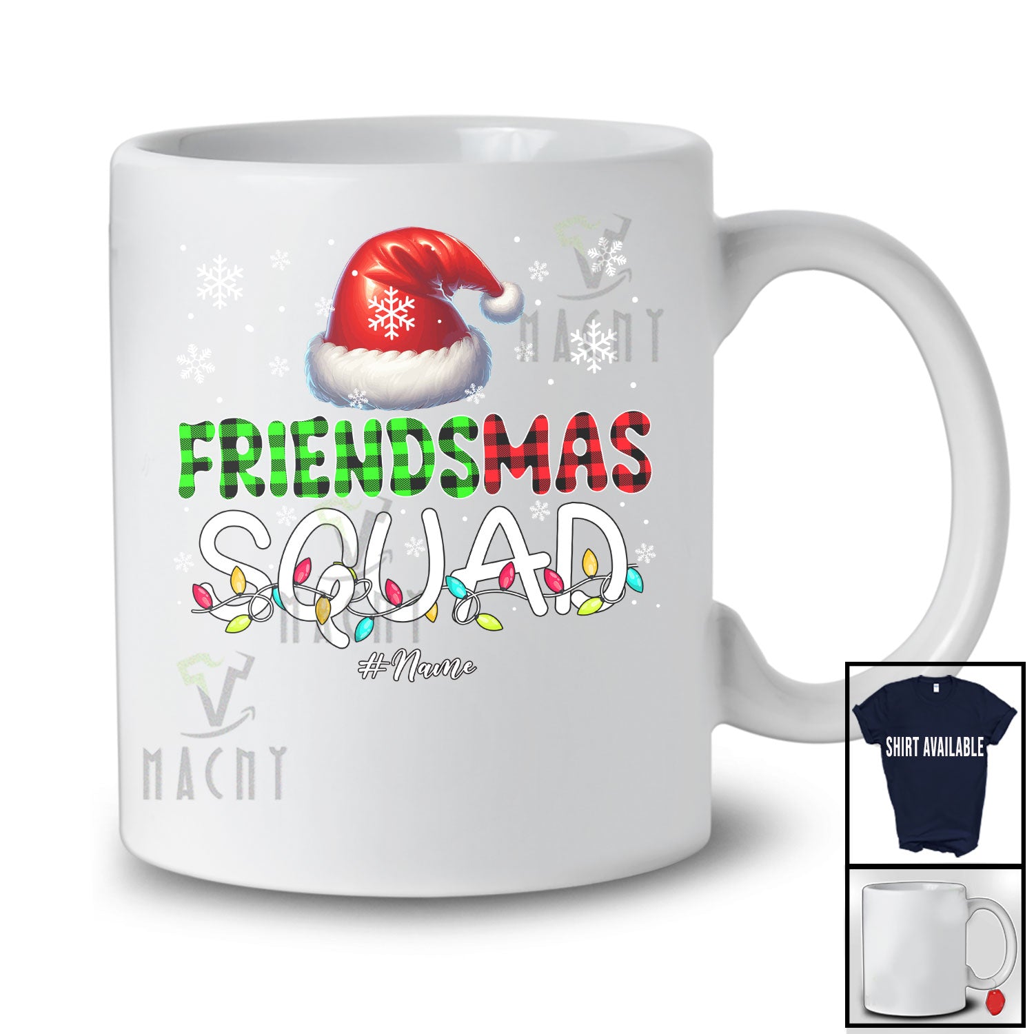 Personalized Friendsmas Squad; Fantastic Christmas Lights Plaid Santa; Custom Name Friends T-Shirt. This cotton t-shirt is a durable staple product with a classic fit. One of the most popular items, it has a relaxed style made for everyday and casual wear.