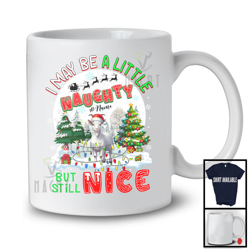 Personalized I May Be A Little Naughty; Humorous Christmas Custom Name Goat Santa T-Shirt. This cotton t-shirt is a durable staple product with a classic fit. One of the most popular items, it has a relaxed style made for everyday and casual wear.