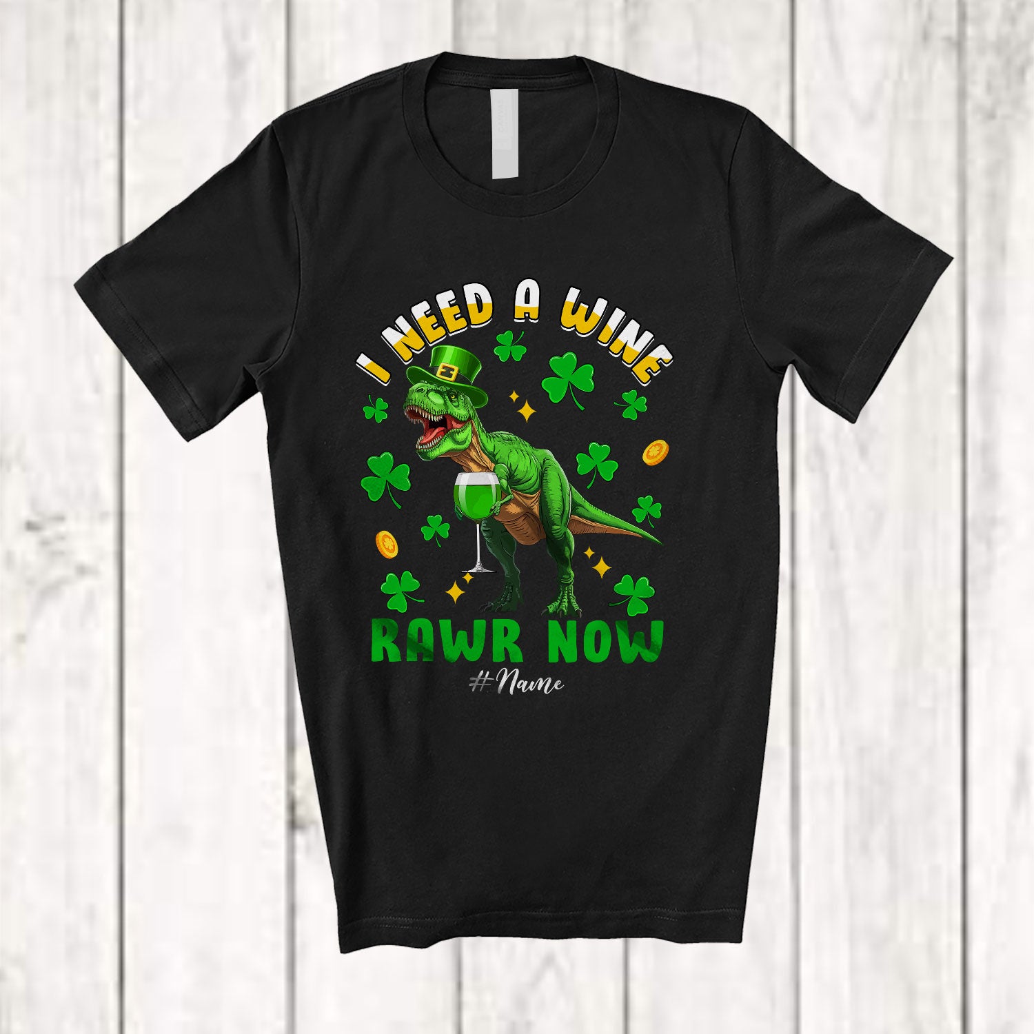 Personalized I Need A Wine Rawr Now; Lovely St. Patrick's Day Custom Name T-Rex Drinking Wine T-Shirt