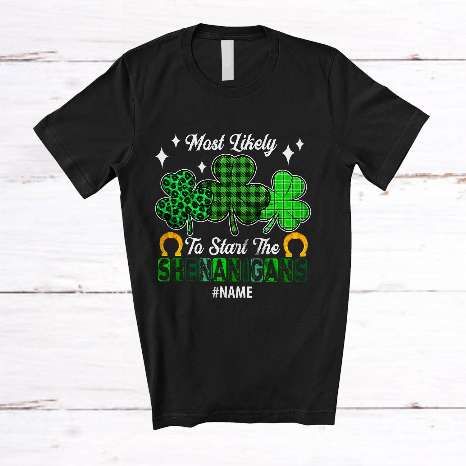 Personalized Likely To Start The Shenanigans; Joyful St. Patrick's Day Custom Name Shamrocks T-Shirt. This cotton t-shirt is a durable staple product with a classic fit. One of the most popular items, it has a relaxed style made for everyday and casual wear.