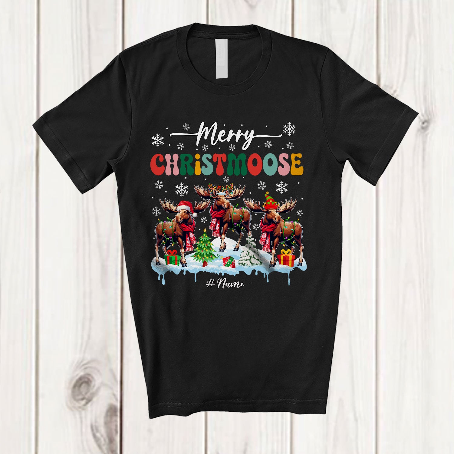 • Personalized Merry Christmoose; Amusing Christmas Groovy; Custom Name Three Moose T-Shirt. This cotton t-shirt is a durable staple product with a classic fit. One of the most popular items, it has a relaxed style made for everyday and casual wear.
