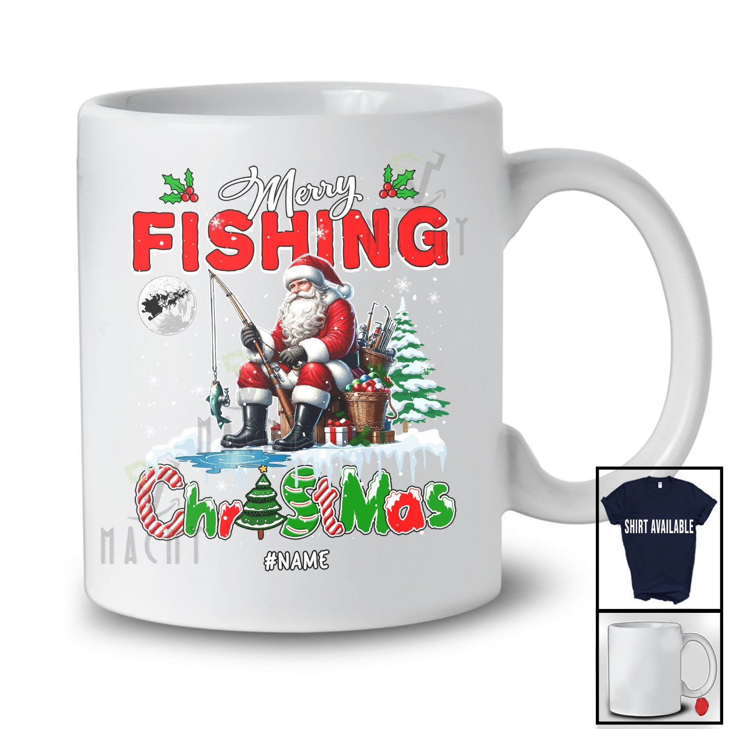 Personalized Merry Fishing Christmas; Amusing X-mas Custom Name Santa Fishing; Snowing Family T-Shirt