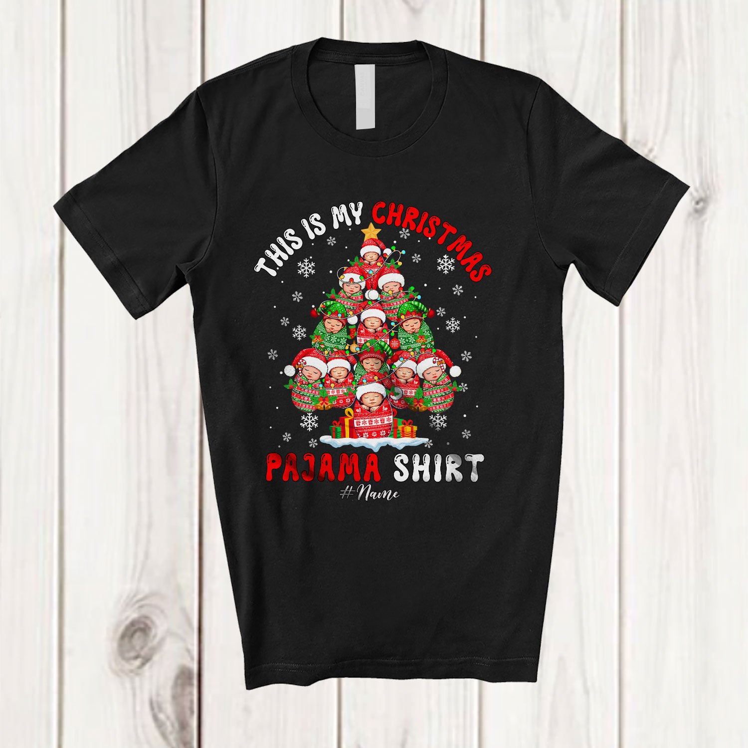 Personalized My Christmas Pajama Shirt; Joyful X-mas Tree Baby; Custom Name NICU Nurse T-Shirt. This cotton t-shirt is a durable staple product with a classic fit. One of the most popular items, it has a relaxed style made for everyday and casual wear.