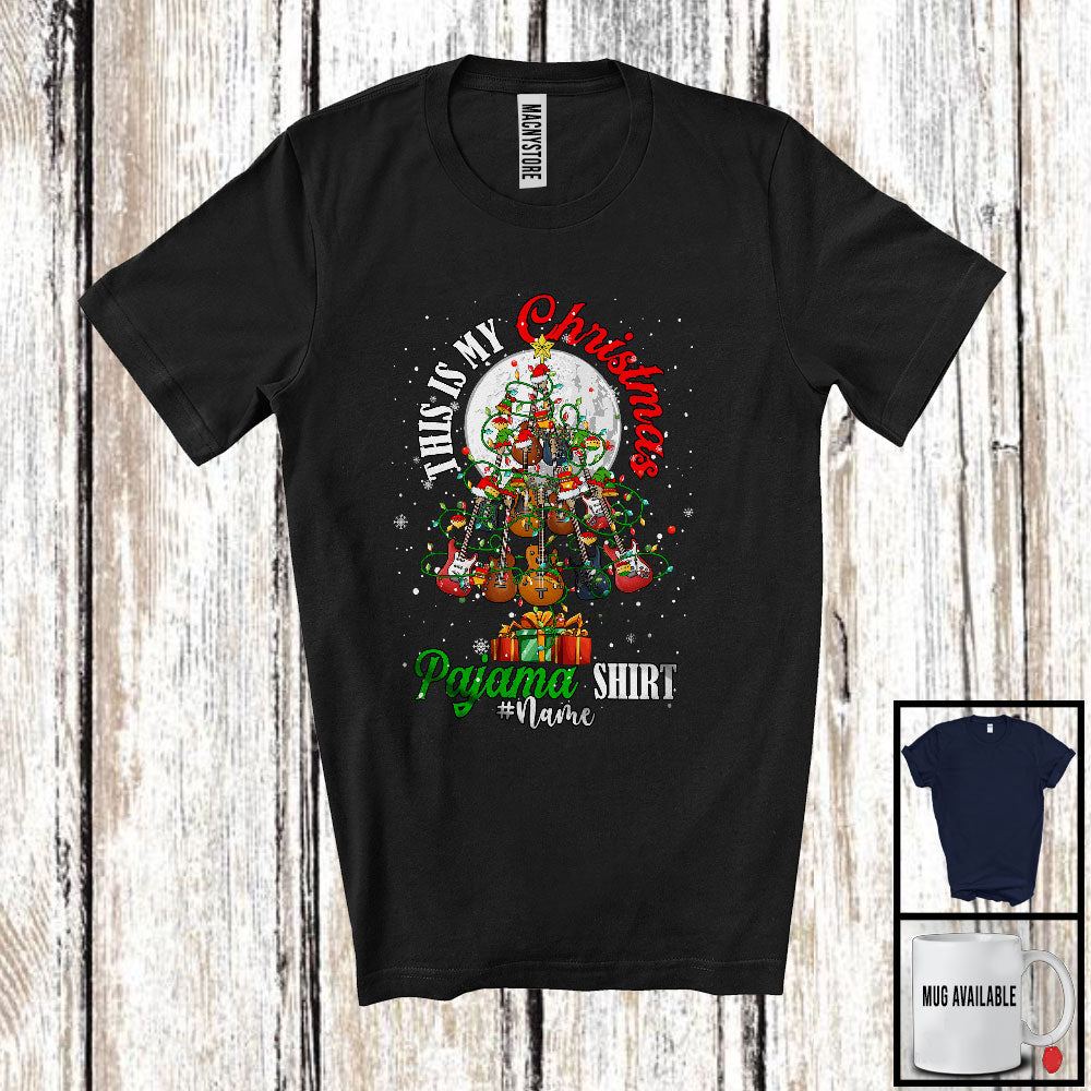 Personalized My Christmas Pajama Shirt; Joyful X-mas Tree Guitar; Custom Name Guitarist Musician T-Shirt