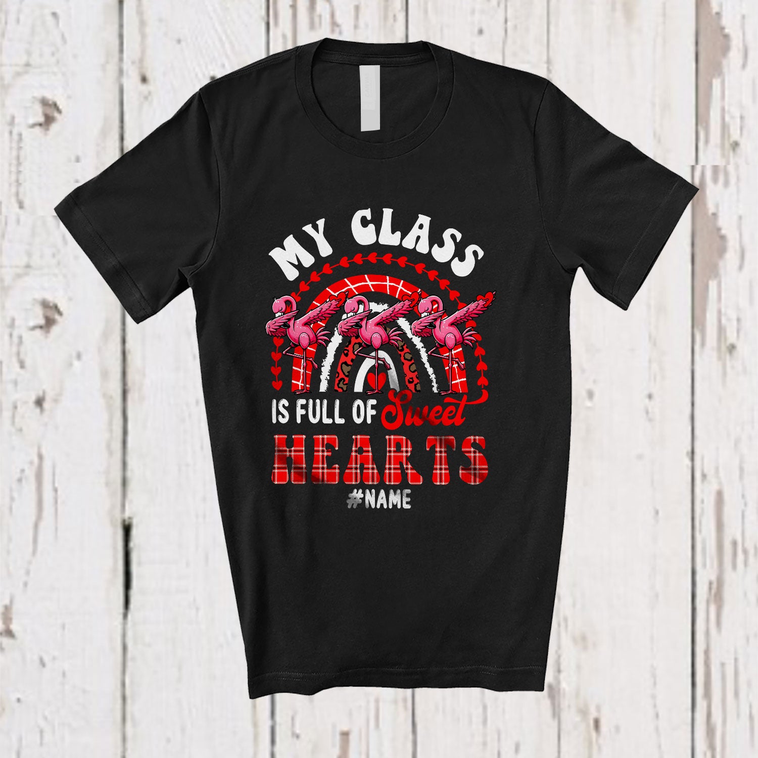 Personalized My Class Full Of Sweet Hearts; Lovely Valentine 3 Dabbing Flamingos; Teacher Rainbow T-Shirt. This cotton t-shirt is a durable staple product with a classic fit. One of the most popular items, it has a relaxed style made for everyday and casual wear.