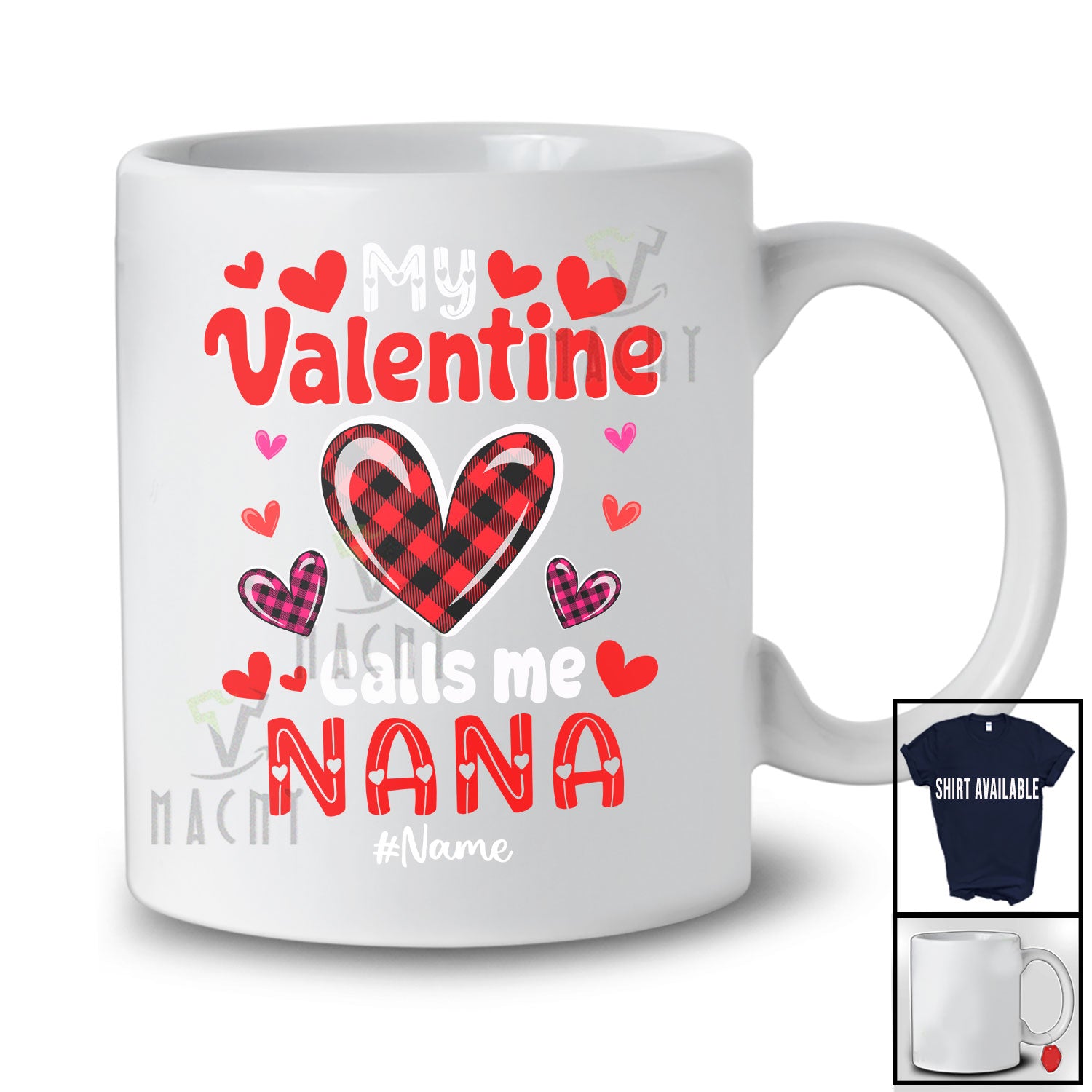 Personalized My Valentine Calls Me Nana; Cheerful Plaid Hearts; Custom Name Grandma Family T-Shirt. This cotton t-shirt is a durable staple product with a classic fit. One of the most popular items, it has a relaxed style made for everyday and casual wear.