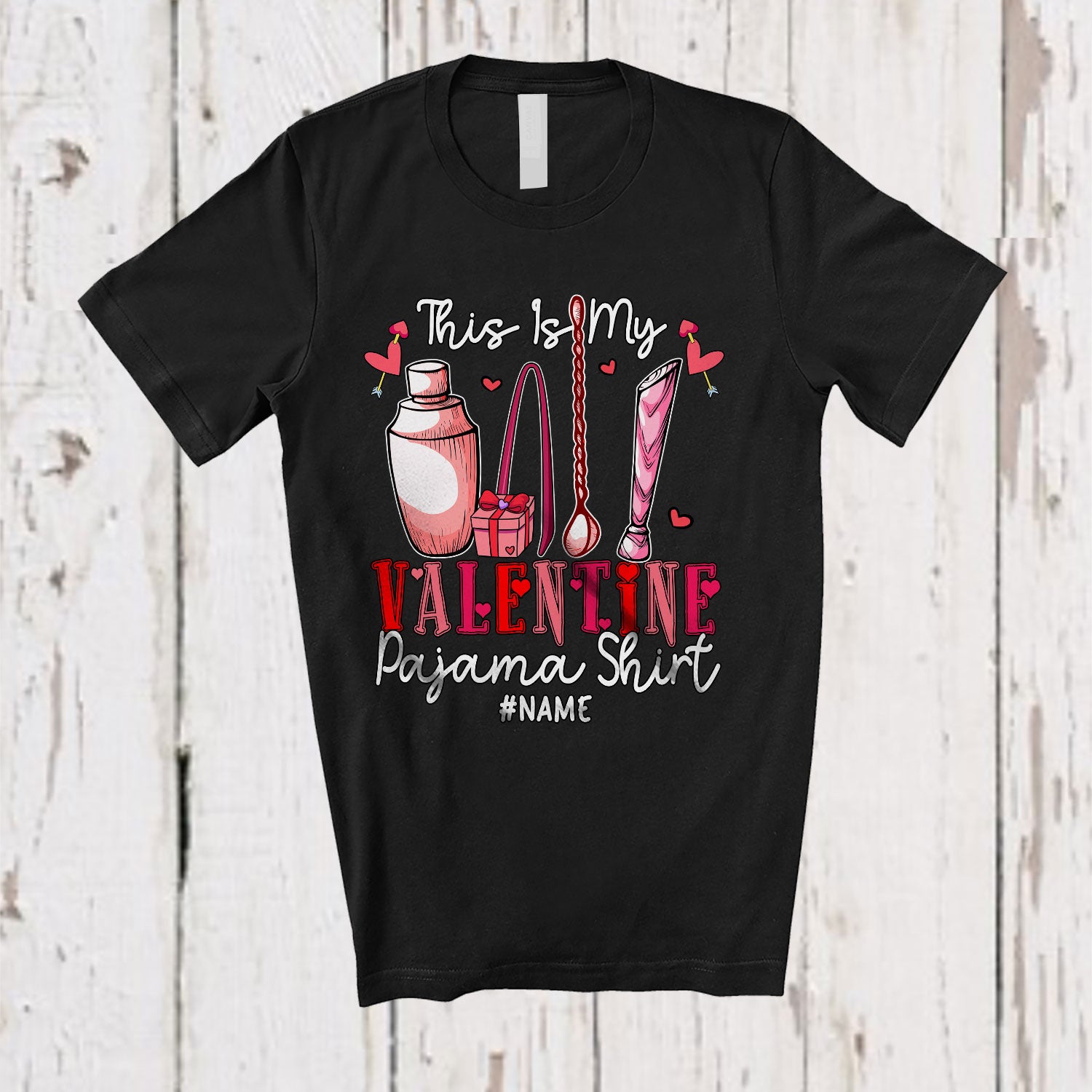 • Personalized My Valentine Pajama Shirt; Amusing Custom Name Bartender Hearts; Couple Family T-Shirt. This cotton t-shirt is a durable staple product with a classic fit. One of the most popular items, it has a relaxed style made for everyday and casual wear.