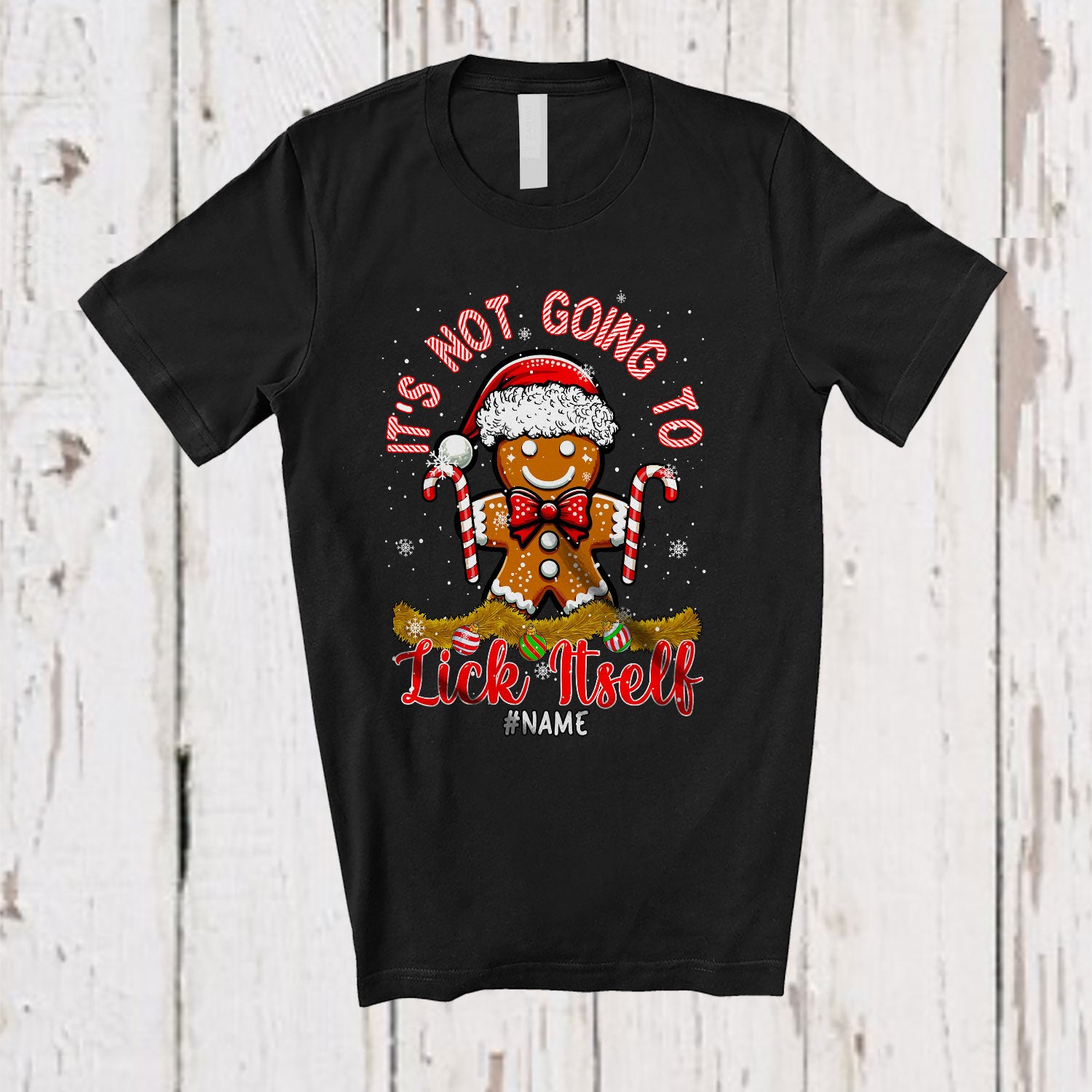 • Personalized Not Going to Lick Itself; Lovely Christmas Candy Cane Gingerbread; Custom Name Adult Family T-Shirt. This cotton t-shirt is a durable staple product with a classic fit. One of the most popular items, it has a relaxed style made for everyday and casual wear.