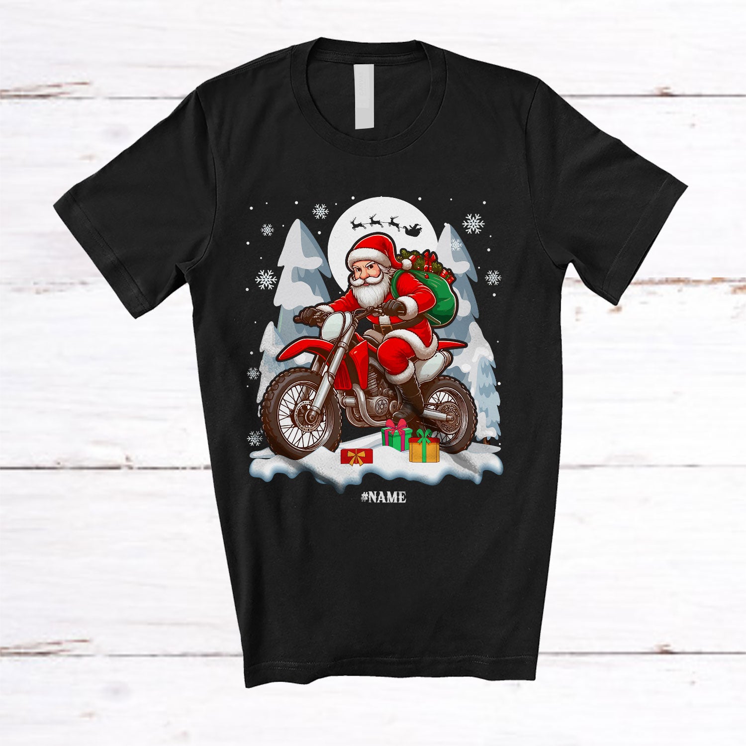 Personalized Santa Riding Dirt Bike; Merry Christmas Custom Name Dirt Bike Biker; Family T-Shirt. This cotton t-shirt is a durable staple product with a classic fit. One of the most popular items, it has a relaxed style made for everyday and casual wear.
