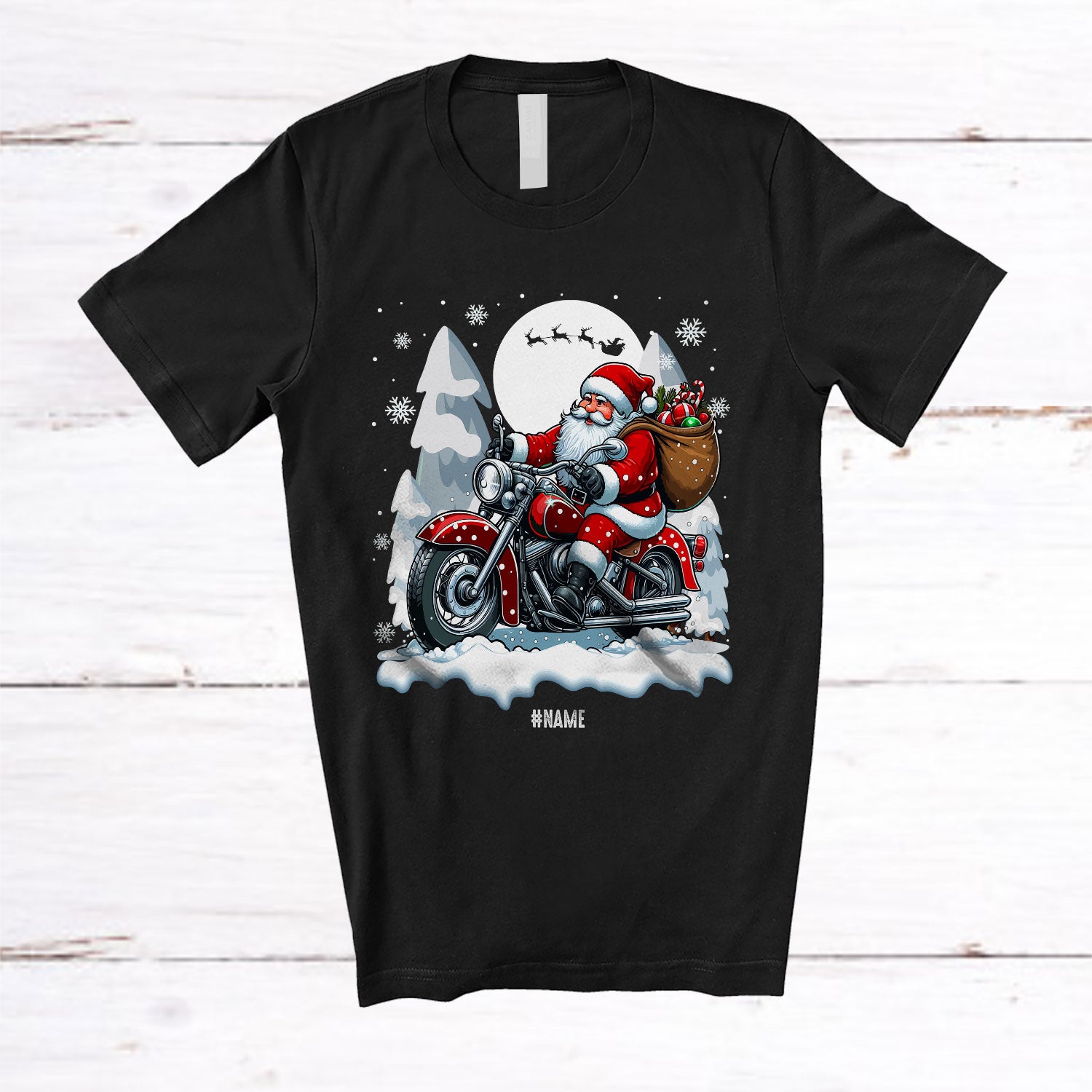 Personalized Santa Riding Motorcycle Truck; Merry Christmas Custom Name Motorcycle Biker T-Shirt. This cotton t-shirt is a durable staple product with a classic fit. One of the most popular items, it has a relaxed style made for everyday and casual wear.
