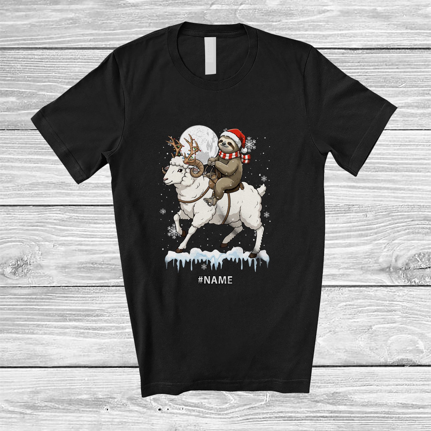 • Personalized Santa Sloth Riding Sheep Reindeer; Lovely Christmas Custom Name Farmer T-Shirt. This cotton t-shirt is a durable staple product with a classic fit. One of the most popular items, it has a relaxed style made for everyday and casual wear.