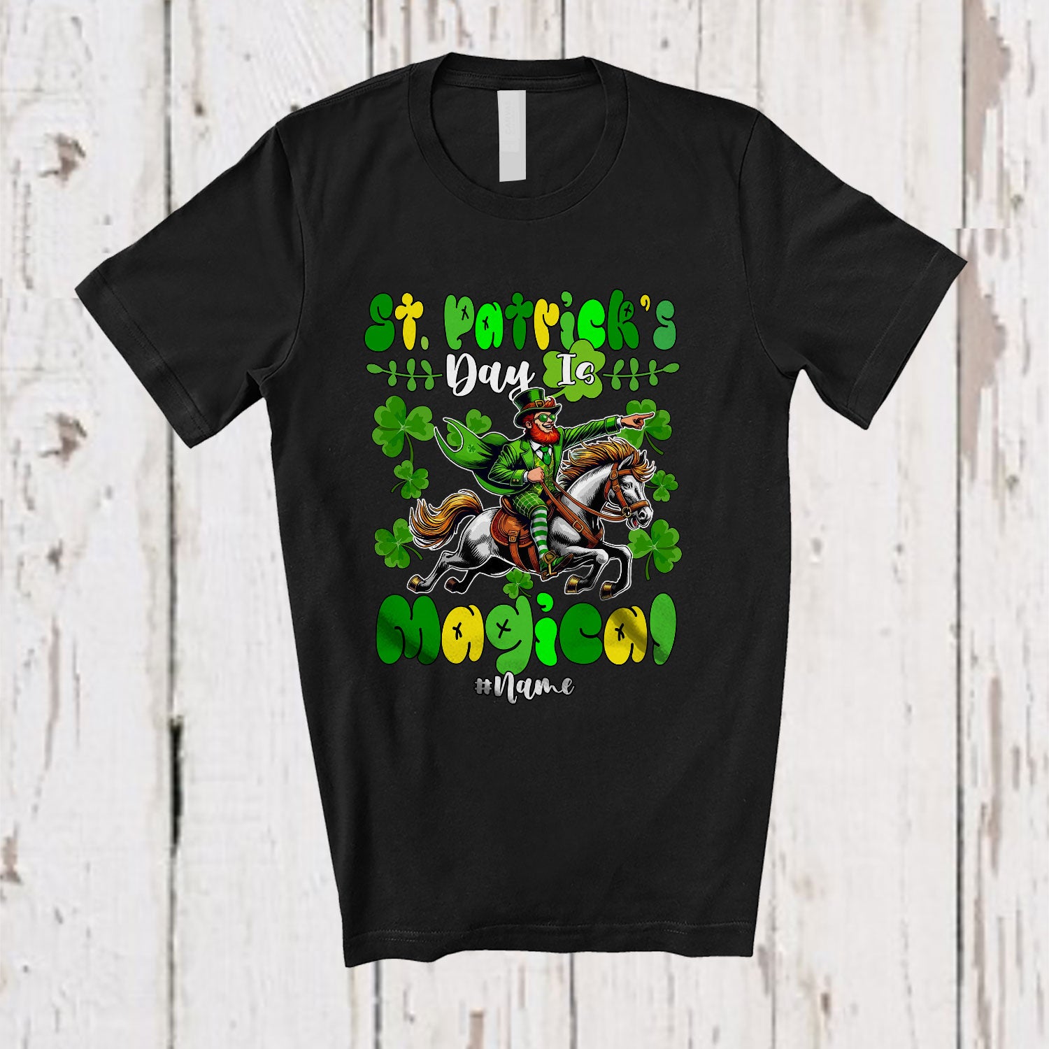 Personalized St. Patrick's Day Is Magical; Joyful Leprechaun Riding Horse; Custom Name Irish Shamrock T-Shirt