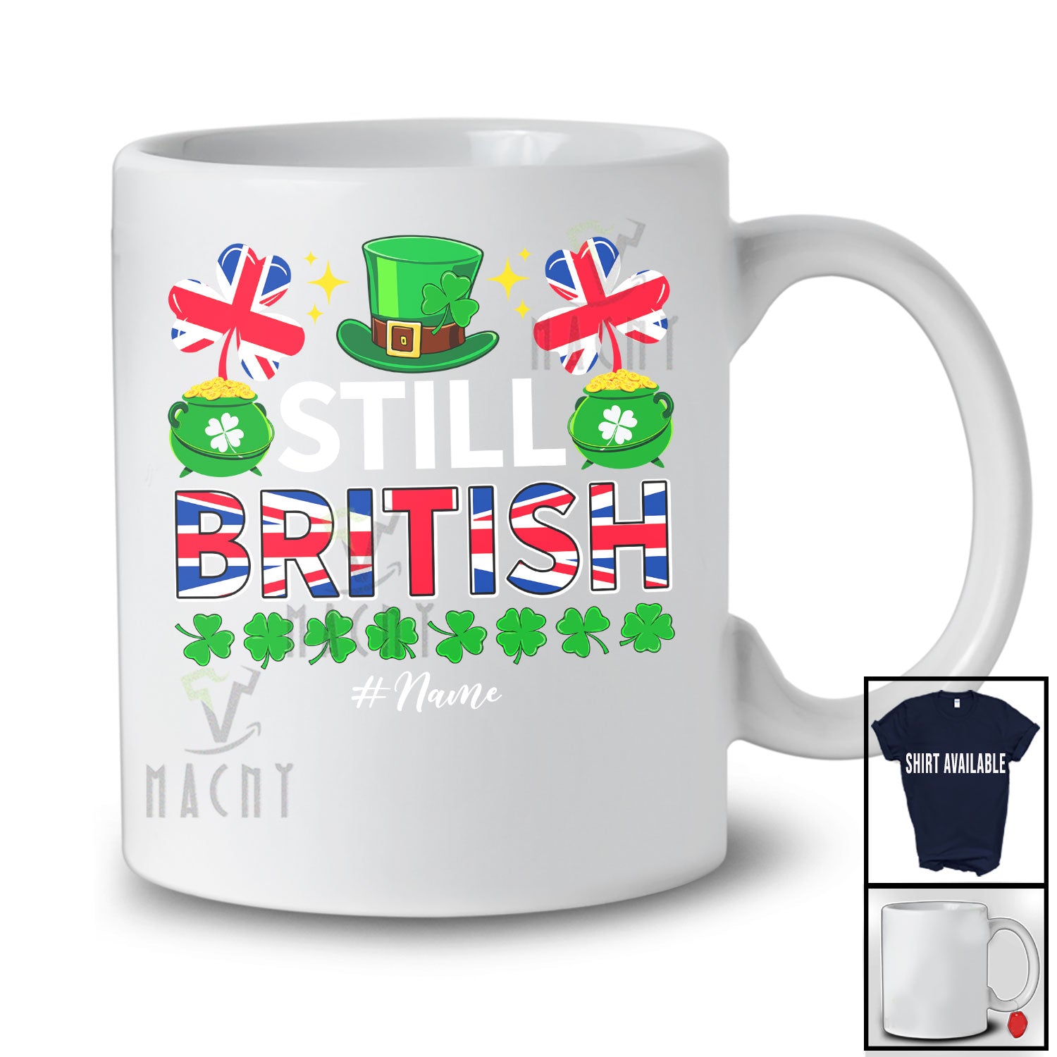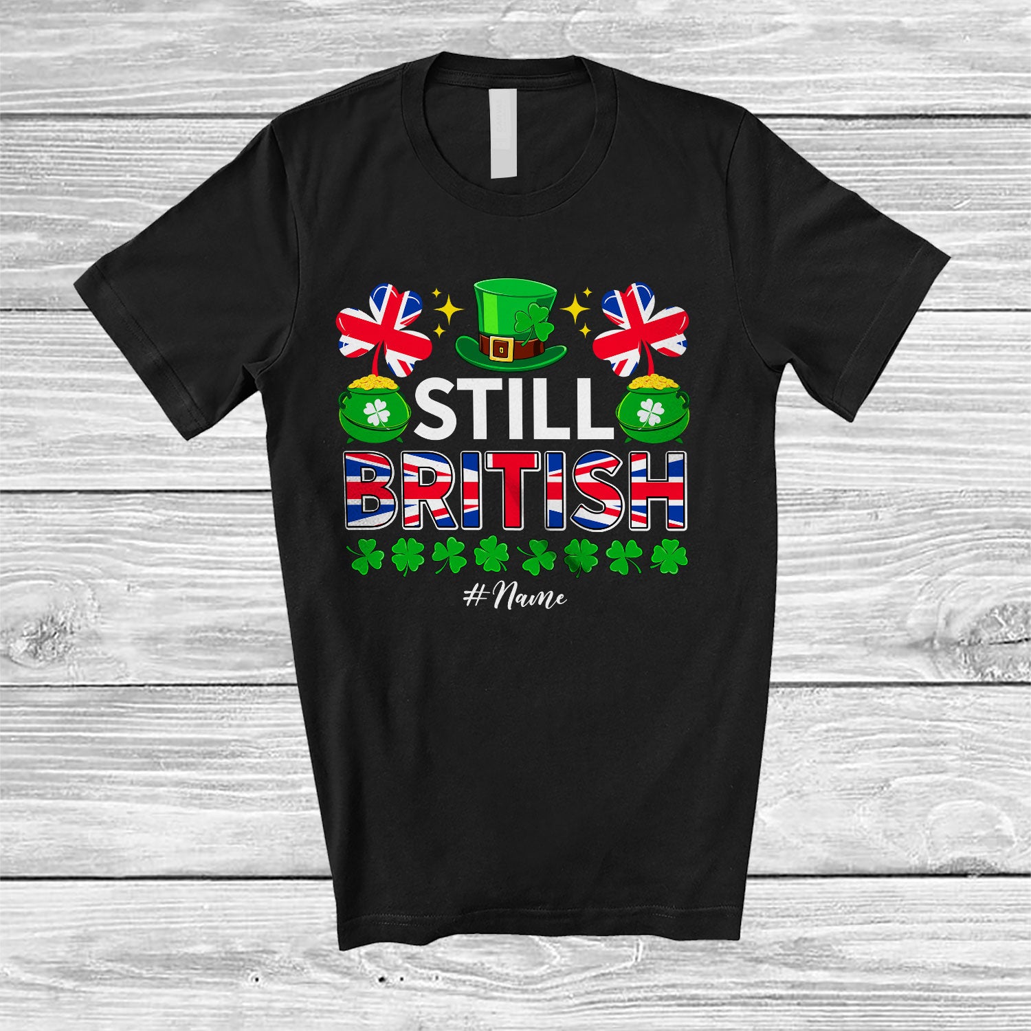 Personalized Still British; Lovely St. Patrick's Day Custom Name Leprechaun British Flag; Family T-Shirt. This cotton t-shirt is a durable staple product with a classic fit. One of the most popular items, it has a relaxed style made for everyday and casual wear.
