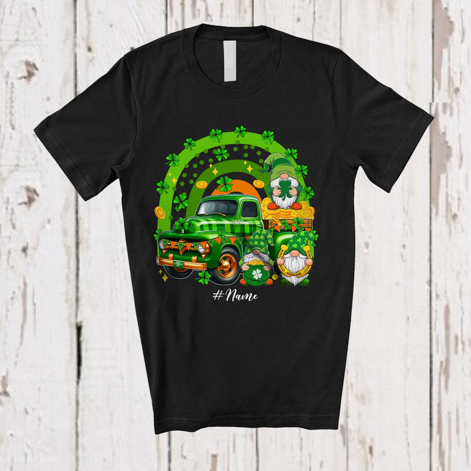 Personalized Three Gnomes With Pickup Truck; Happy St. Patrick's Day Rainbow; Custom Name Family T-Shirt. This cotton t-shirt is a durable staple product with a classic fit. One of the most popular items, it has a relaxed style made for everyday and casual wear.