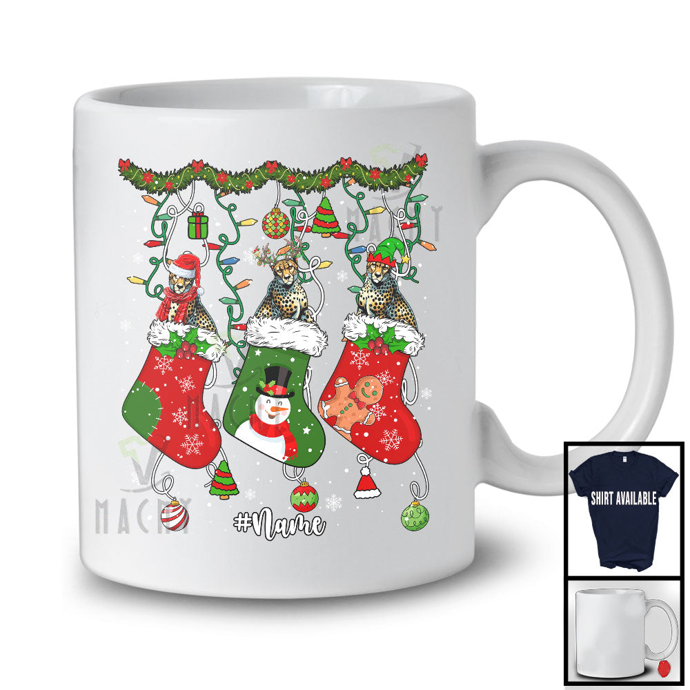 Personalized Three Santa Elf Cheetah In Christmas Socks; Lovely Wild Animal Lover; Snowing T-Shirt