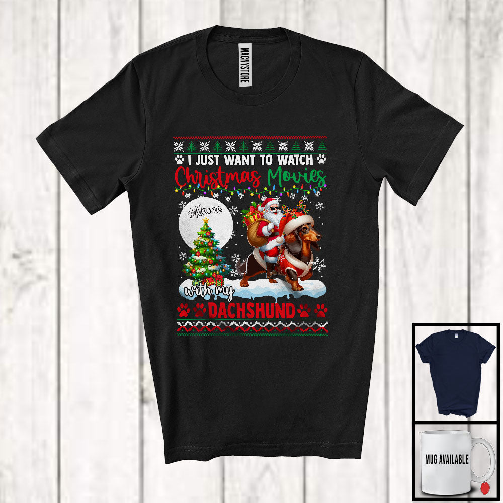 Personalized Watch Christmas Movies With My Dachshund; Joyful Santa Riding Puppy; X-mas Tree T-Shirt