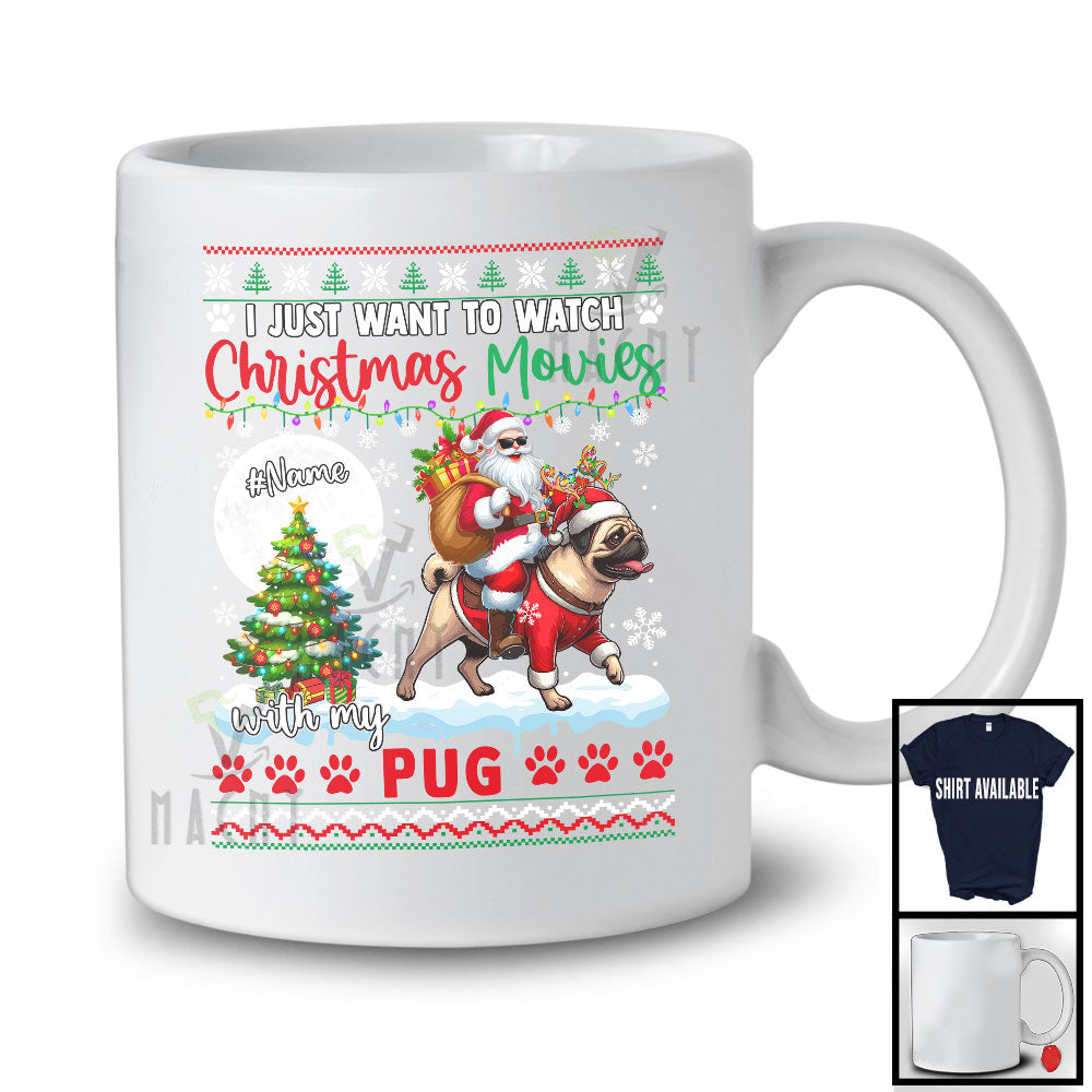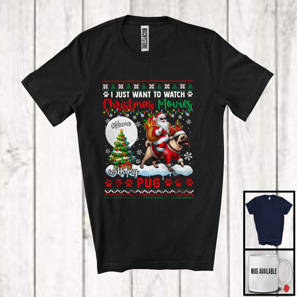 Personalized Watch Christmas Movies With My Pug; Joyful Santa Riding Puppy; X-mas Tree T-Shirt