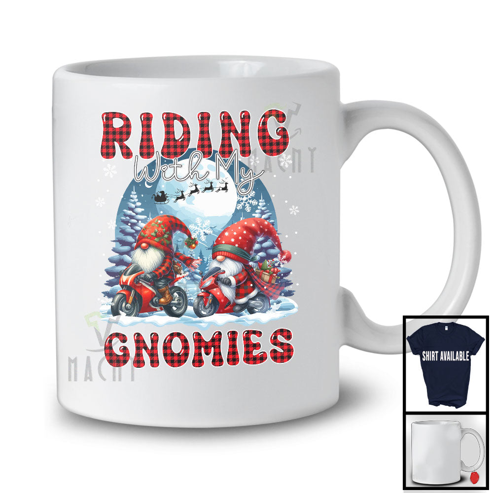Riding with my Gnomies; Funny Couple Gnomes Riding Motorbike Christmas Group T-Shirt. This cotton t-shirt is a durable staple product with a classic fit. One of the most popular items, it has a relaxed style made for everyday and casual wear.