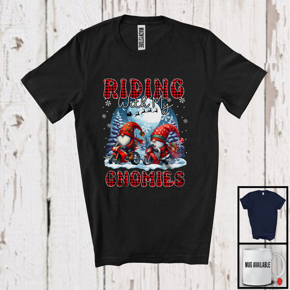 Riding with my Gnomies; Funny Couple Gnomes Riding Motorbike Christmas Group T-Shirt