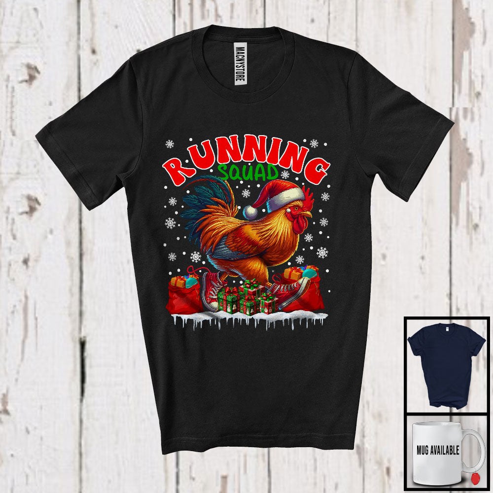 Running Squad, Joyful Christmas Snow Santa Chicken Rooster Running, Marathon Runner Group T-Shirt. This cotton t-shirt is a durable staple product with a classic fit. One of the most popular items, it has a relaxed style made for everyday and casual wear.