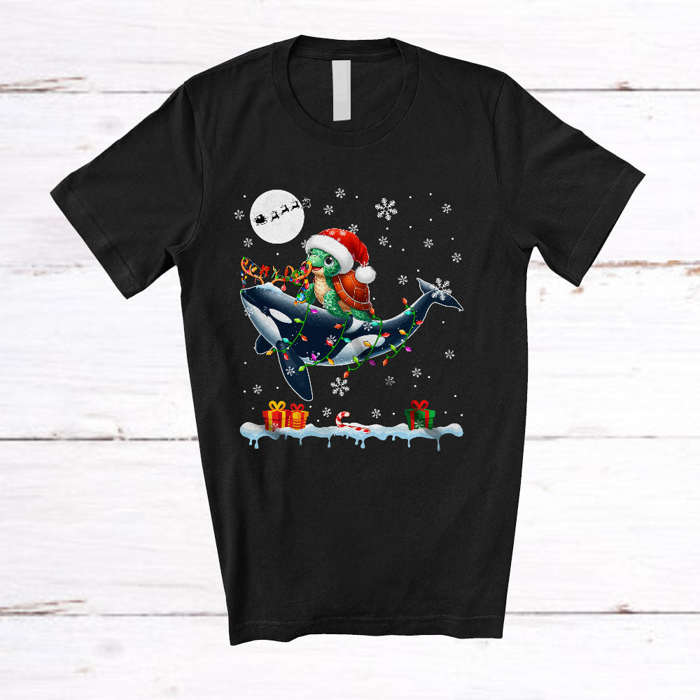 Santa Turtle Riding Reindeer Orca; Amusing Christmas Lights Sea Animal Lover; Family T-Shirt