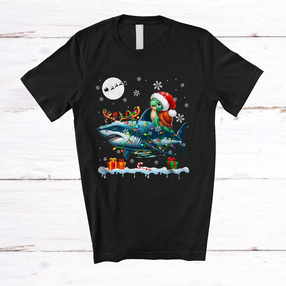 Santa Turtle Riding Reindeer Shark; Amusing Christmas Lights Sea Animal Lover; Family T-Shirt