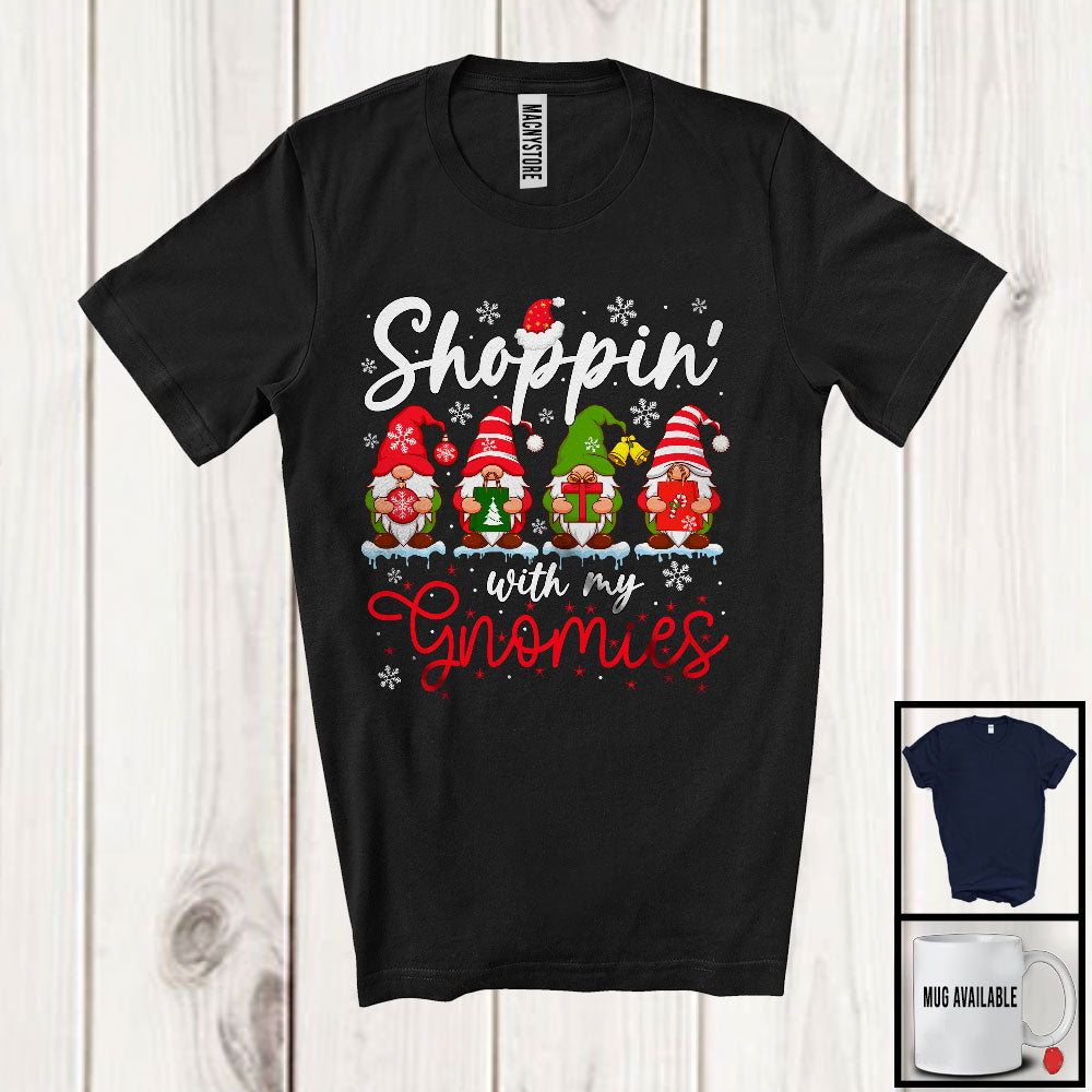 Shoppin' With My Gnomies; Amusing Christmas Four Gnomes Snowing; Gnomies Family Group T-Shirt. This cotton t-shirt is a durable staple product with a classic fit. One of the most popular items, it has a relaxed style made for everyday and casual wear.