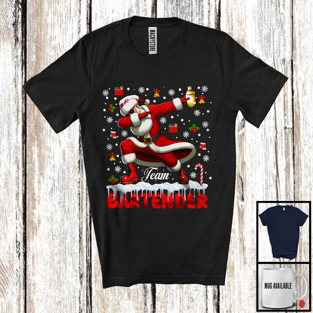 • Team Bartender, Merry Christmas Santa Snowing, X-mas Matching Proud Careers Group T-Shirt. This cotton t-shirt is a durable staple product with a classic fit. One of the most popular items, it has a relaxed style made for everyday and casual wear.
