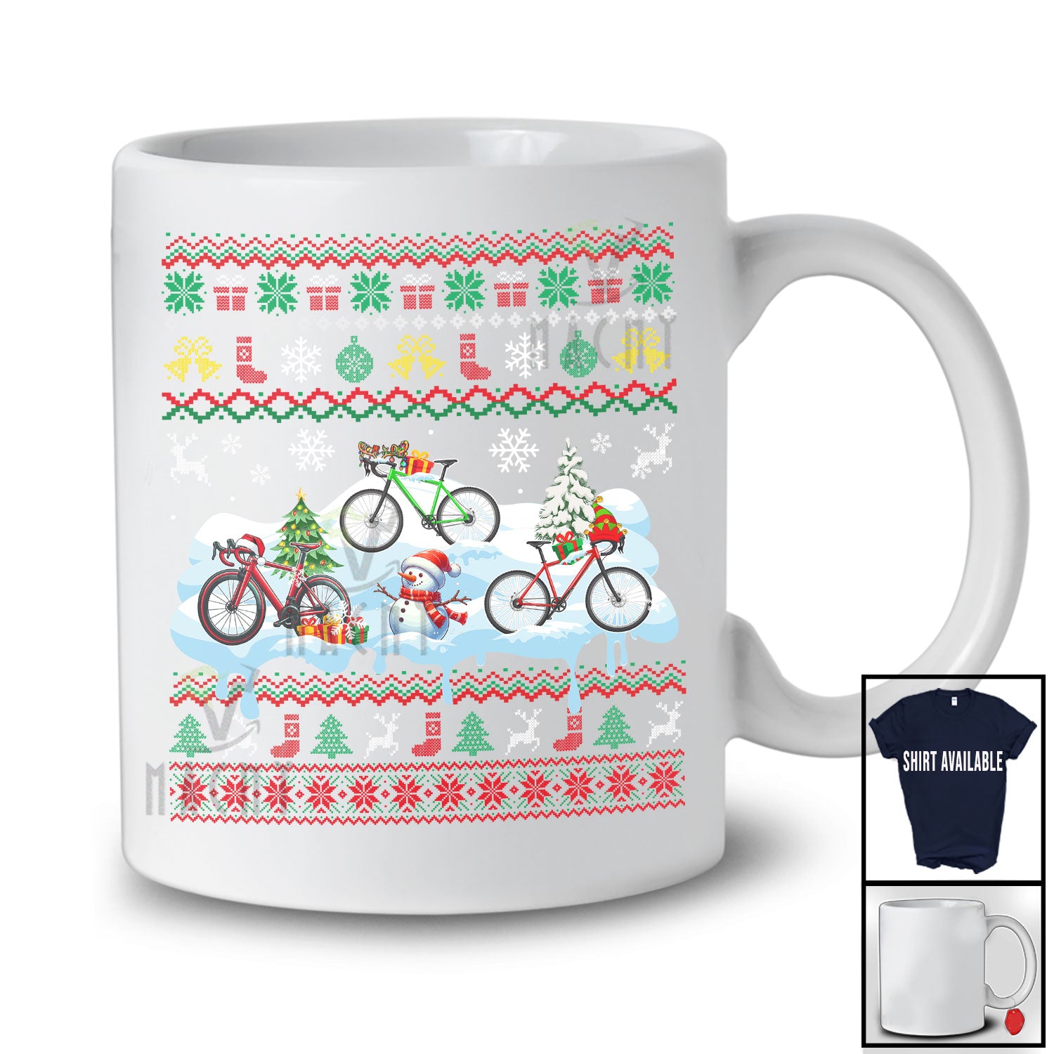 • Three Santa Elf Reindeer Bicycle Snowing; Awesome Christmas Sweater Snowman; Rider T-Shirt. This cotton t-shirt is a durable staple product with a classic fit. One of the most popular items, it has a relaxed style made for everyday and casual wear.