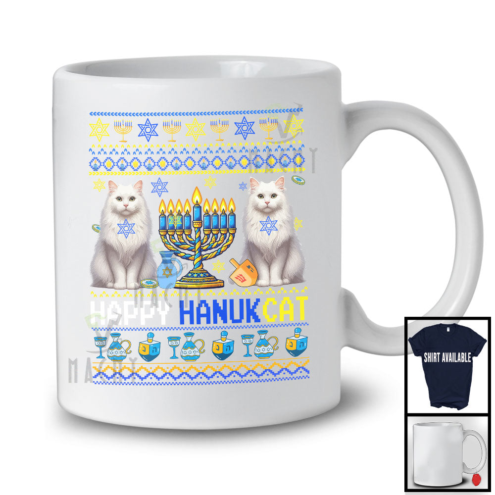 • Happy HanukCat; Adorable Hanukkah Sweater Two Cat Menorah; Chanukah Matching Family Group T-Shirt. This cotton t-shirt is a durable staple product with a classic fit. One of the most popular items, it has a relaxed style made for everyday and casual wear.