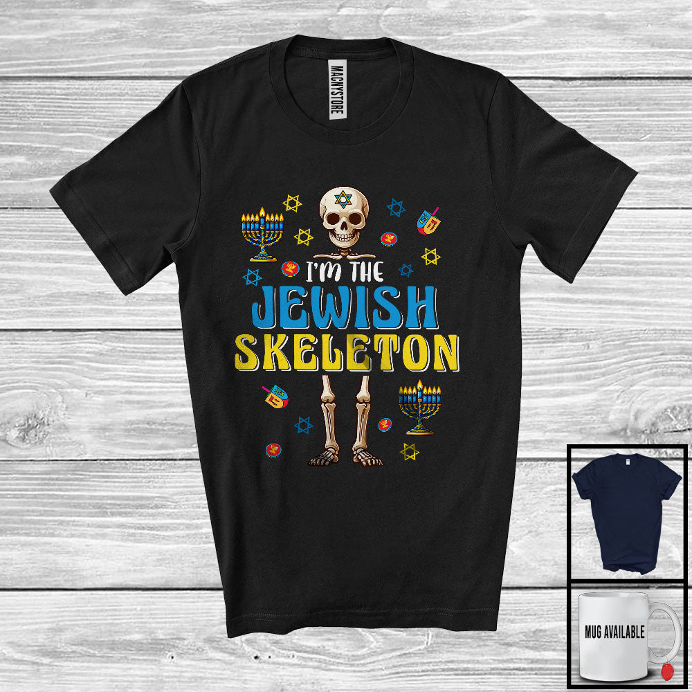 • I'm The Jewish Skeleton; Awesome Hanukkah Skeleton Costume Menorah; Family Group T-Shirt. This cotton t-shirt is a durable staple product with a classic fit. One of the most popular items, it has a relaxed style made for everyday and casual wear.