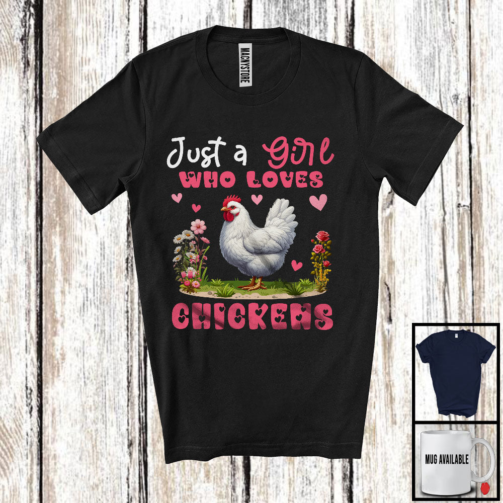 Just A Girl Who Loves Chickens, Floral Farm Animals Farmer, Women Flowers Family Group T-Shirt. This cotton t-shirt is a durable staple product with a classic fit. One of the most popular items, it has a relaxed style made for everyday and casual wear.