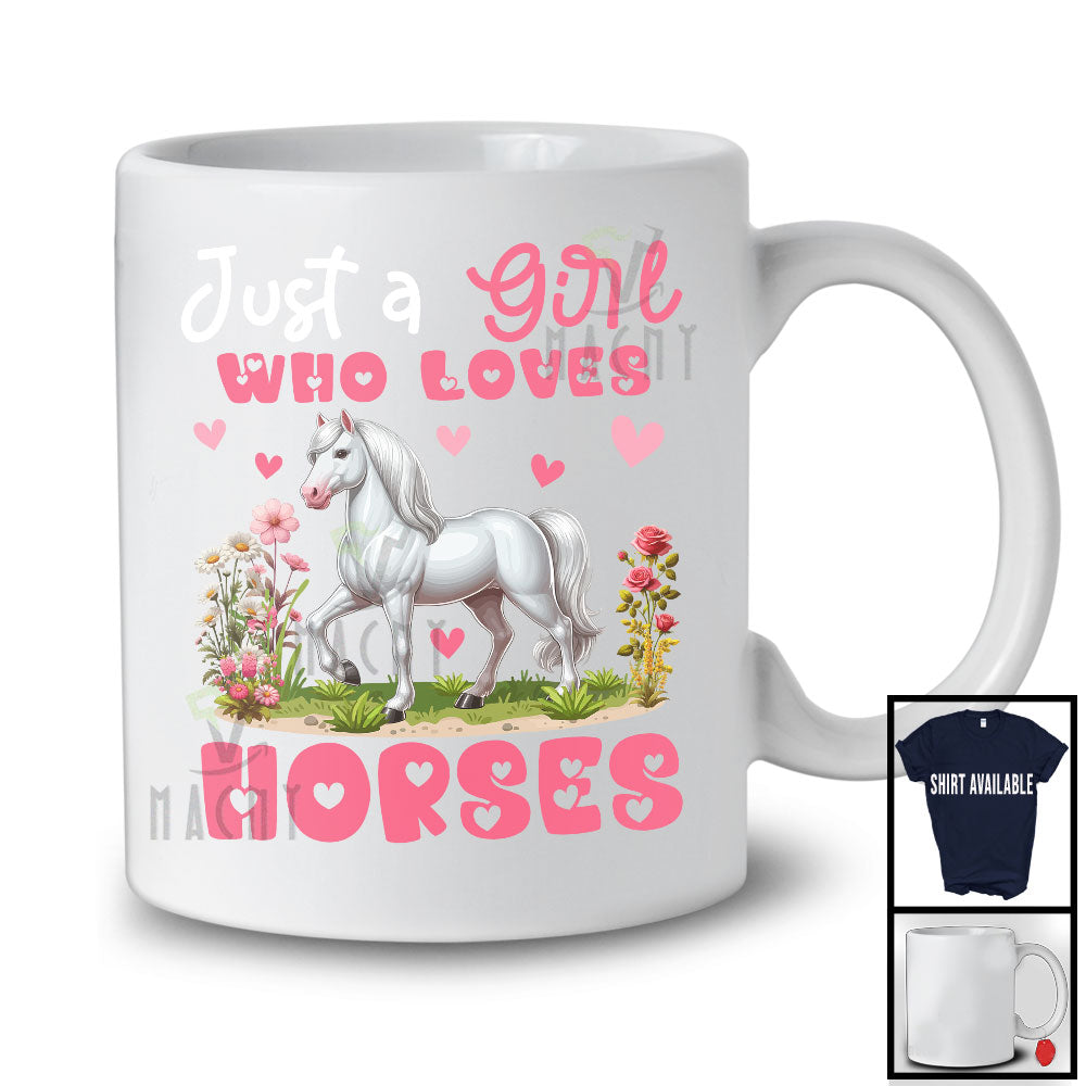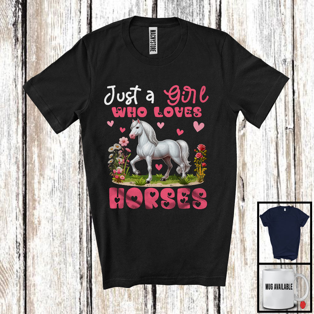 Just A Girl Who Loves Horses, Floral Farm Animals Farmer, Women Flowers Family Group T-Shirt. This cotton t-shirt is a durable staple product with a classic fit. One of the most popular items, it has a relaxed style made for everyday and casual wear.