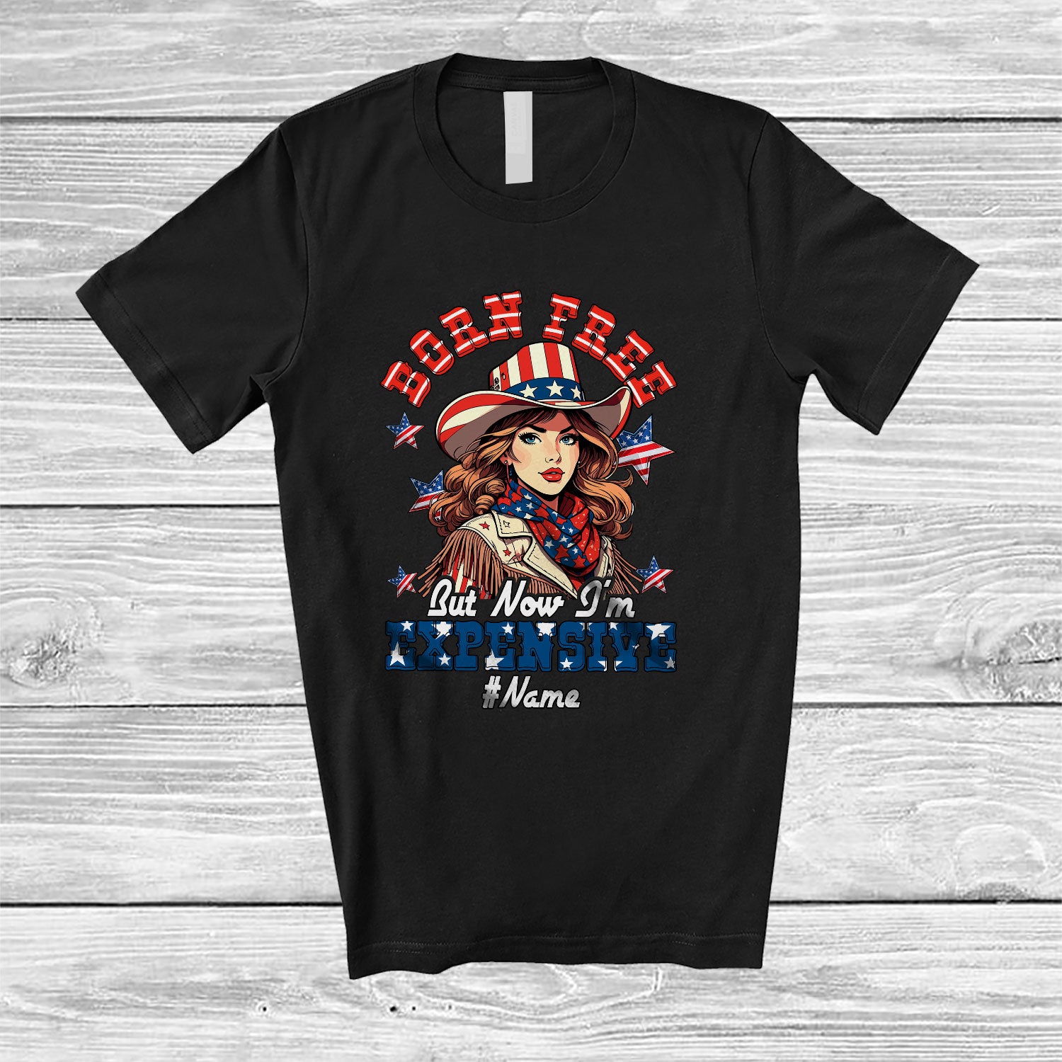 Personalized Custom Name Born Free But I'm Expensive; Amazing 4th Of July US Flag Women; Patriotic T-Shirt. This cotton t-shirt is a durable staple product with a classic fit. One of the most popular items, it has a relaxed style made for everyday and casual wear.