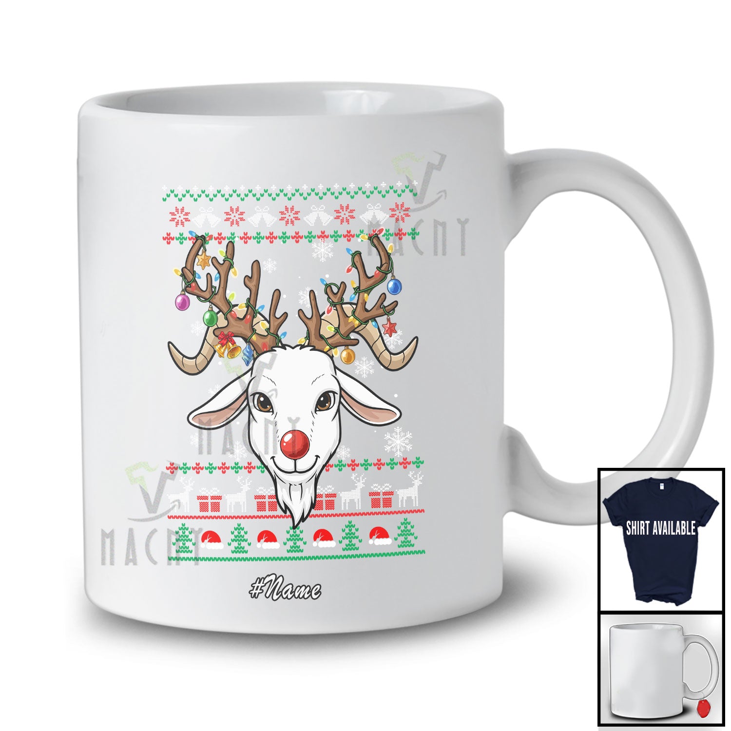 • Personalized Custom Name Christmas Reindeer Goat Face; Lovely Sweater Ornaments Lights Farmer T-Shirt. This cotton t-shirt is a durable staple product with a classic fit. One of the most popular items, it has a relaxed style made for everyday and casual wear.