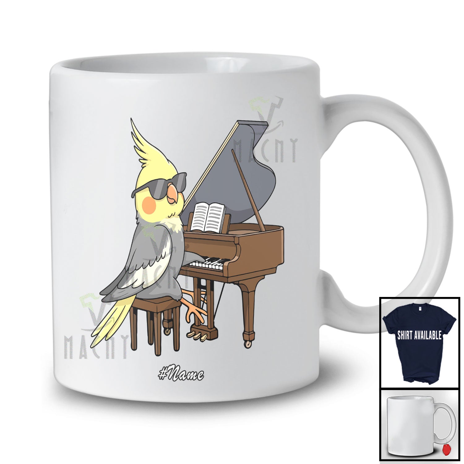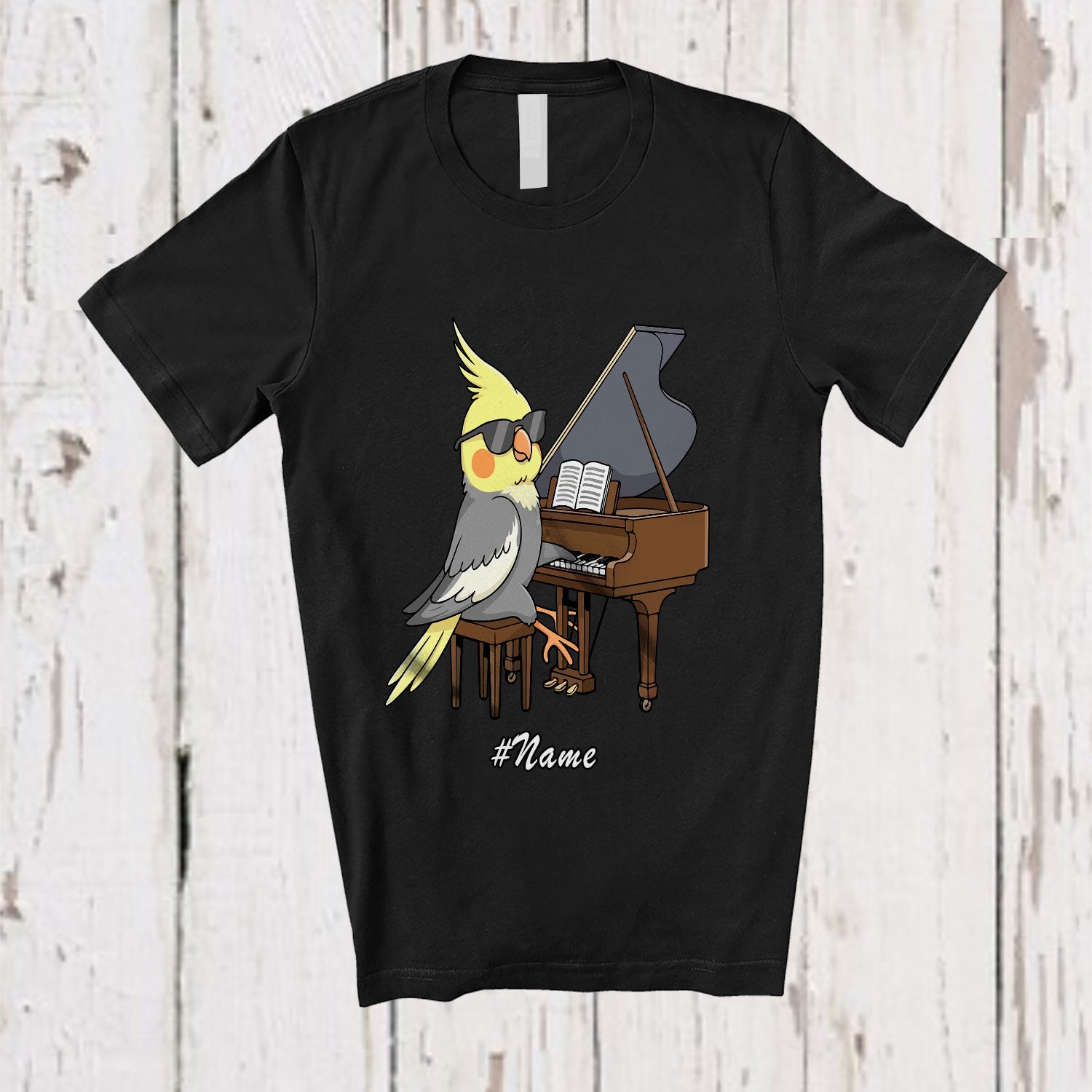 • Personalized Custom Name Cockatiel Playing Piano; Humorous Musician Musical Instruments T-Shirt. This cotton t-shirt is a durable staple product with a classic fit. One of the most popular items, it has a relaxed style made for everyday and casual wear.
