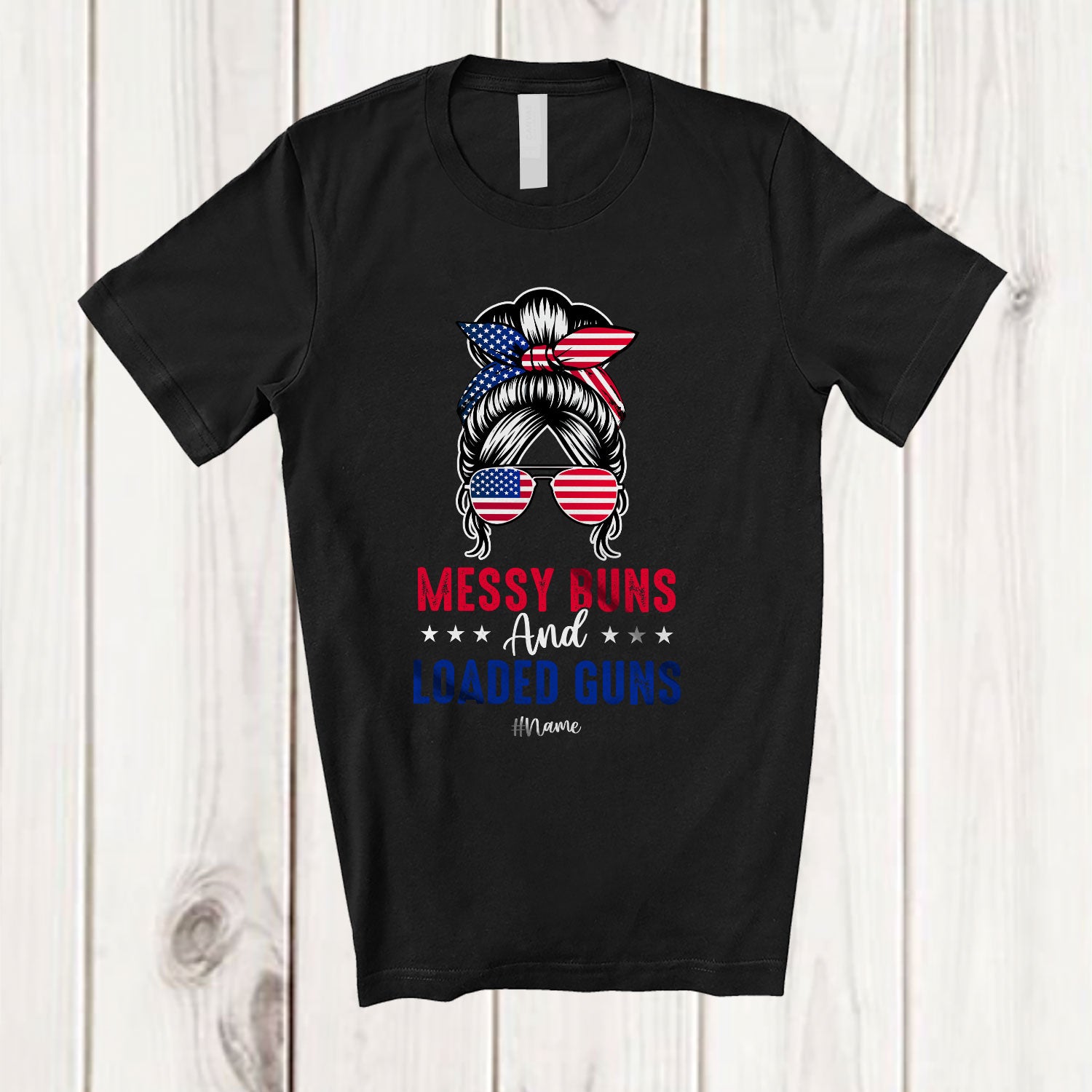 Personalized Custom Name Messy Buns And Loaded Guns; Proud 4th Of July Women Girl; Patriotic T-Shirt