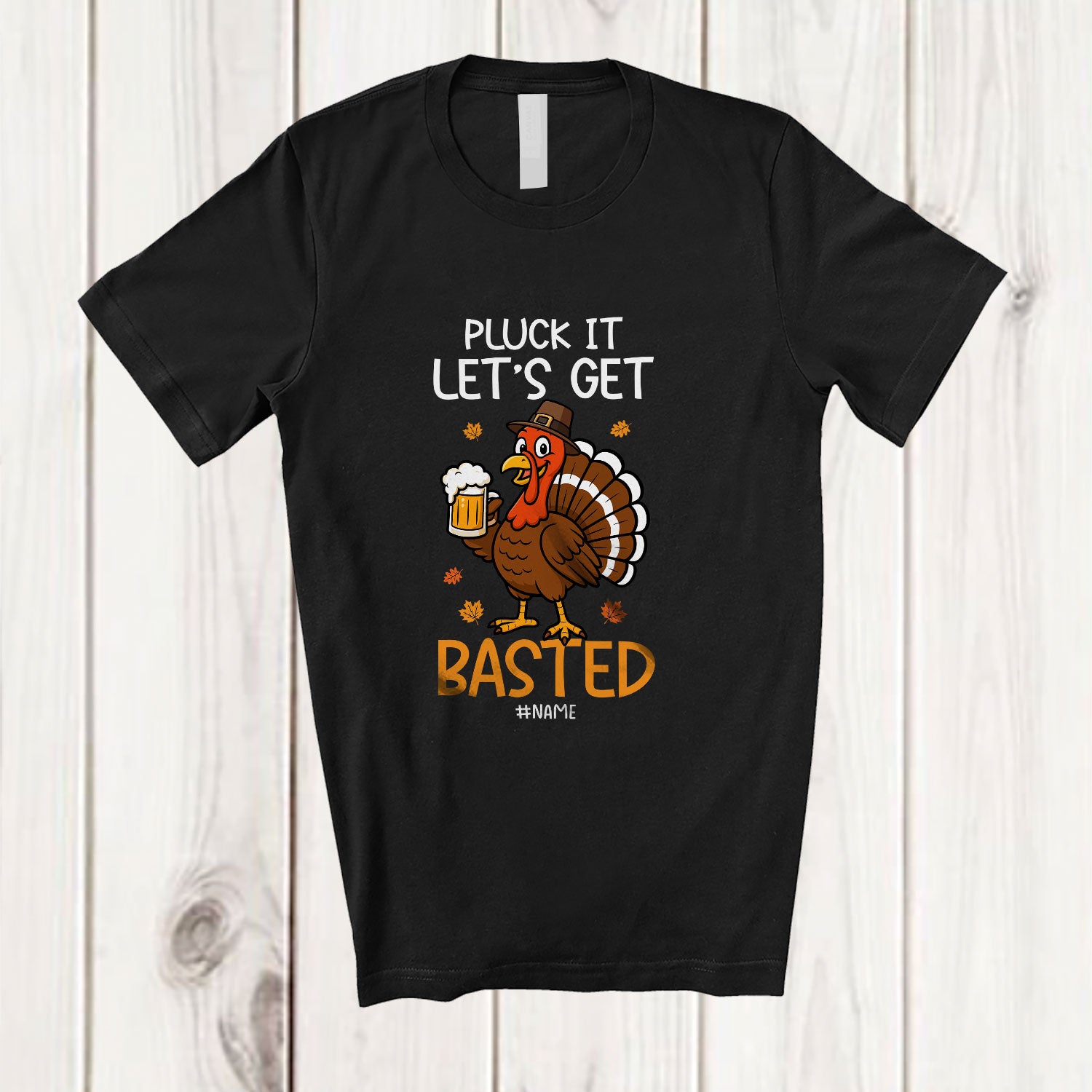 Personalized Custom Name Pluck Basted; Amusing Thanksgiving Turkey Beer Drinking Men; Family T-Shirt. This cotton t-shirt is a durable staple product with a classic fit. One of the most popular items, it has a relaxed style made for everyday and casual wear.