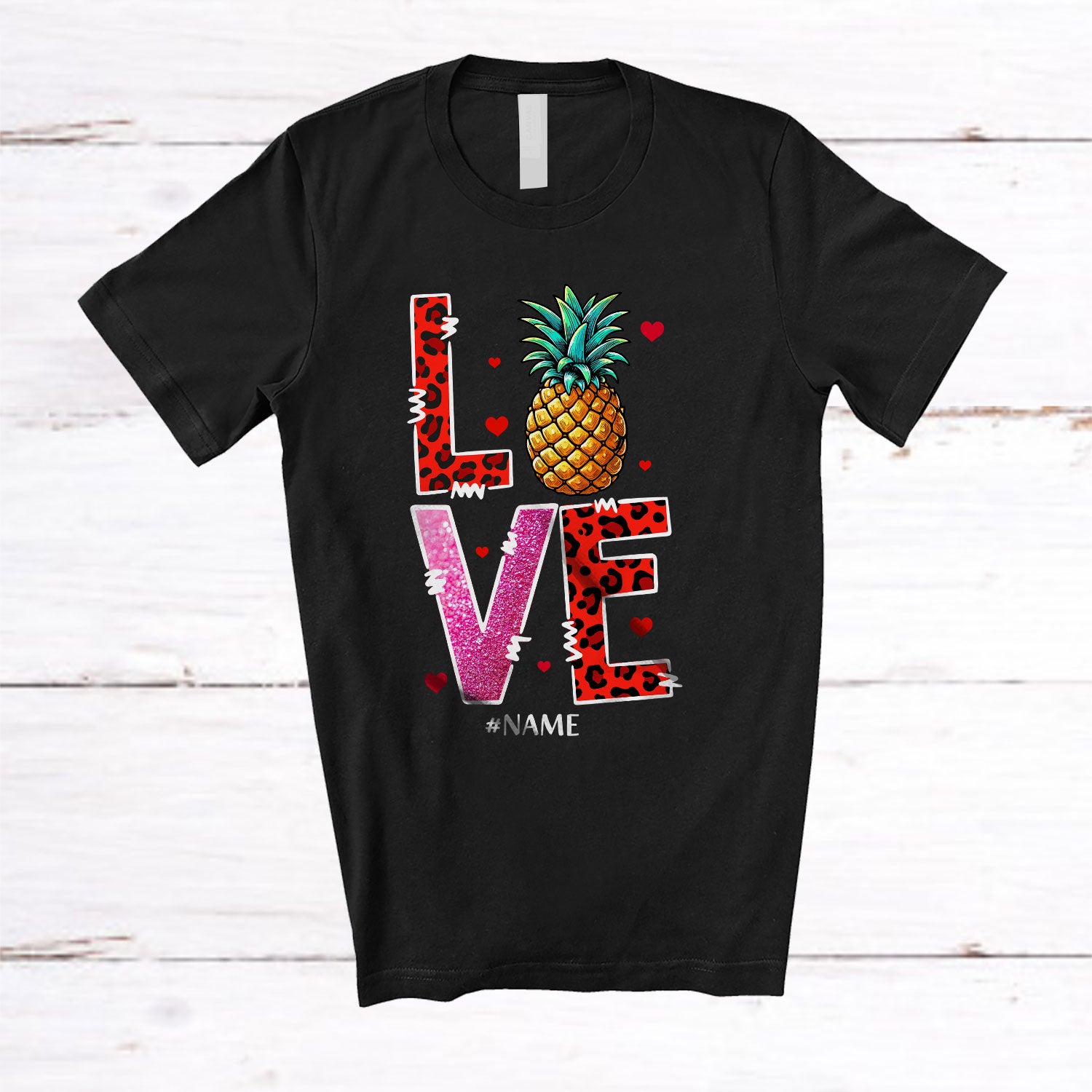 Personalized LOVE; Amazing Valentine's Day Pineapple Leopard Hearts; Custom Name Women Single T-Shirt