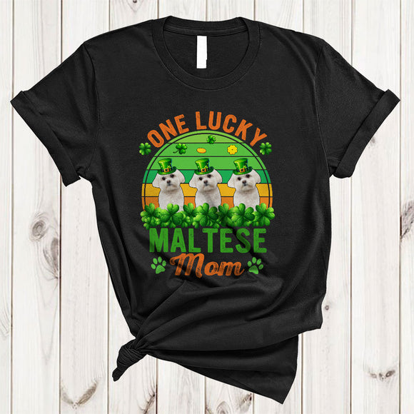 One Lucky Maltese Mom, Lovely St. Patrick's Day Three Leprechaun Dog, Retro Shamrocks T-Shirt