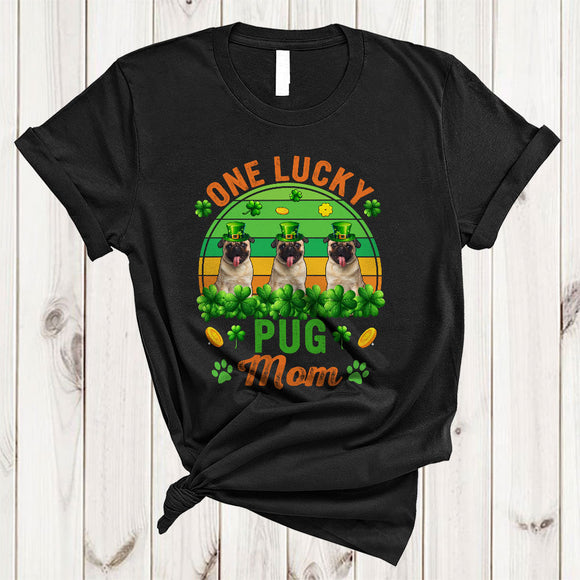 One Lucky Pug Mom, Lovely St. Patrick's Day Three Leprechaun Dog, Retro Shamrocks T-Shirt