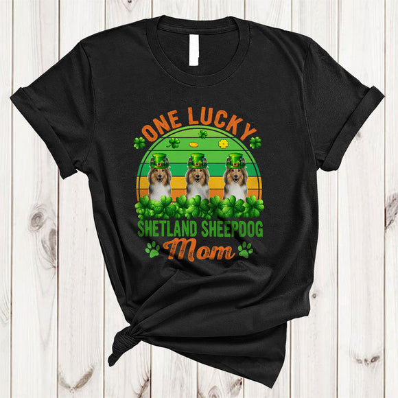 One Lucky Shetland Sheepdog Mom, Lovely St. Patrick's Day Three Leprechaun Dog, Retro Shamrocks T-Shirt